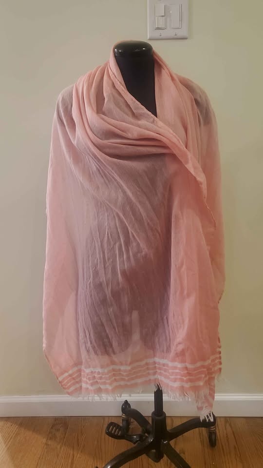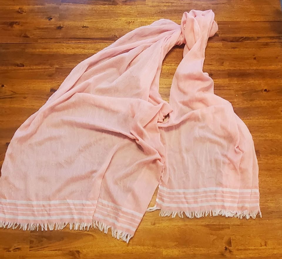 Delicate pink scarf shawl wrap. White stripes and fringe on the ends. Versatile layering piece - everyday, beach, summer nights