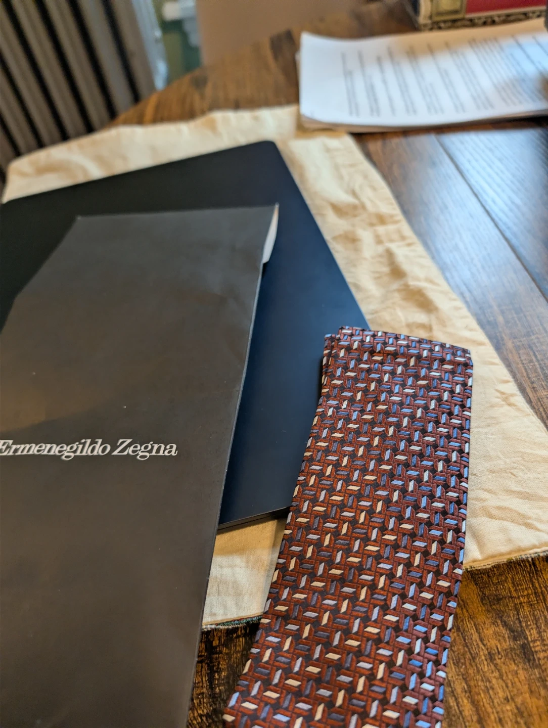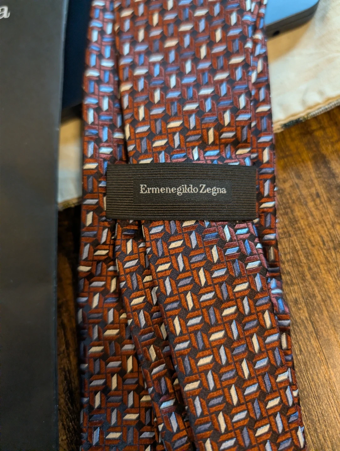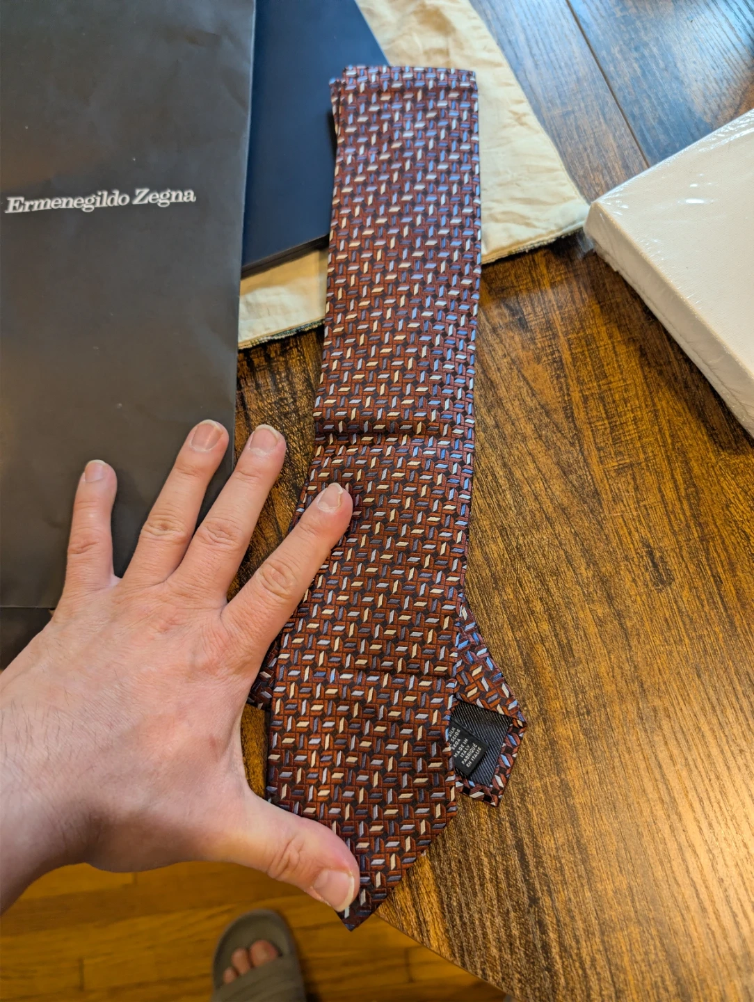 Here's a stylish Ermenegildo Zegna tie! It features a beautiful brown pattern on silk. It comes with its original packaging.