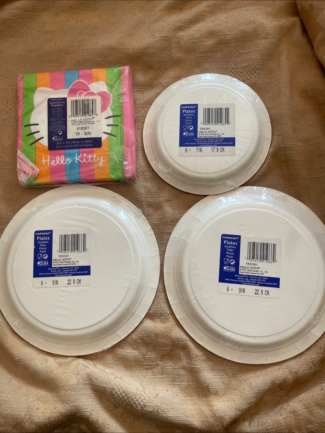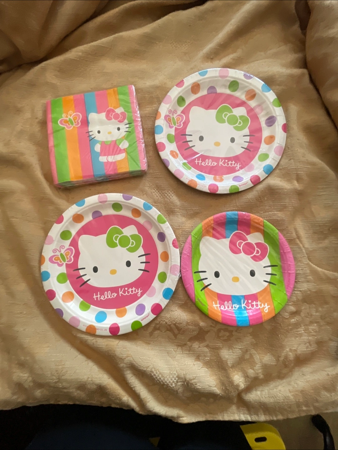 Selling a set of Hello Kitty paper plates and napkins! The set includes plates that are 7 inches and 9 inches in diameter, plus a pack of adorable Hello Kitty napkins