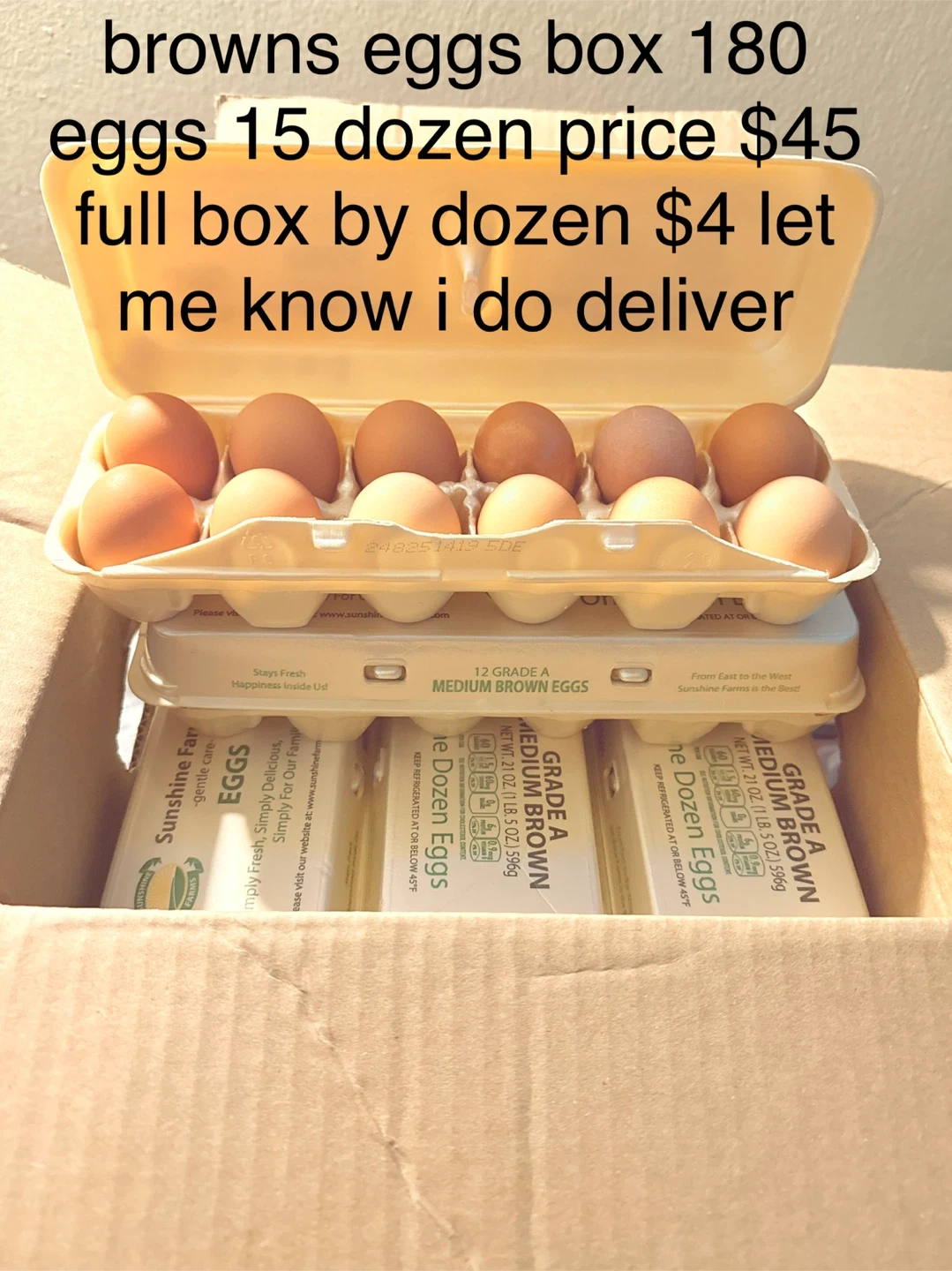 101Selling a box of 180 brown eggs, which is 15 dozens. The eggs are medium grade A. Full box for $45, or $4 per dozen