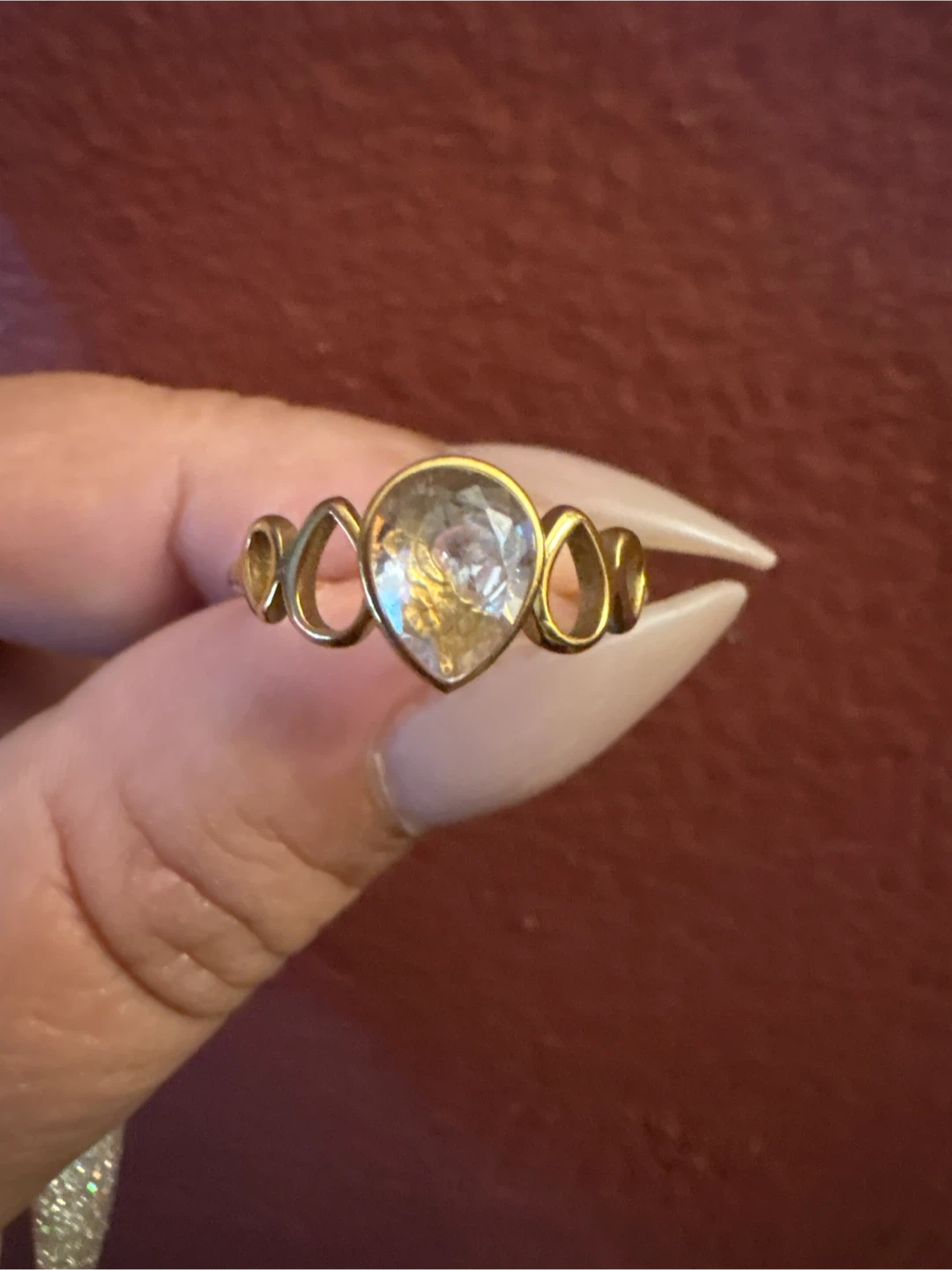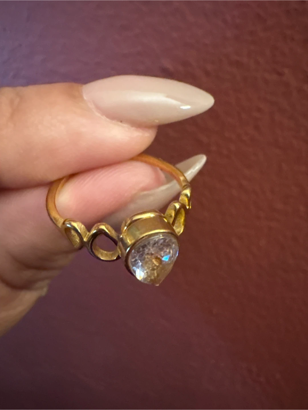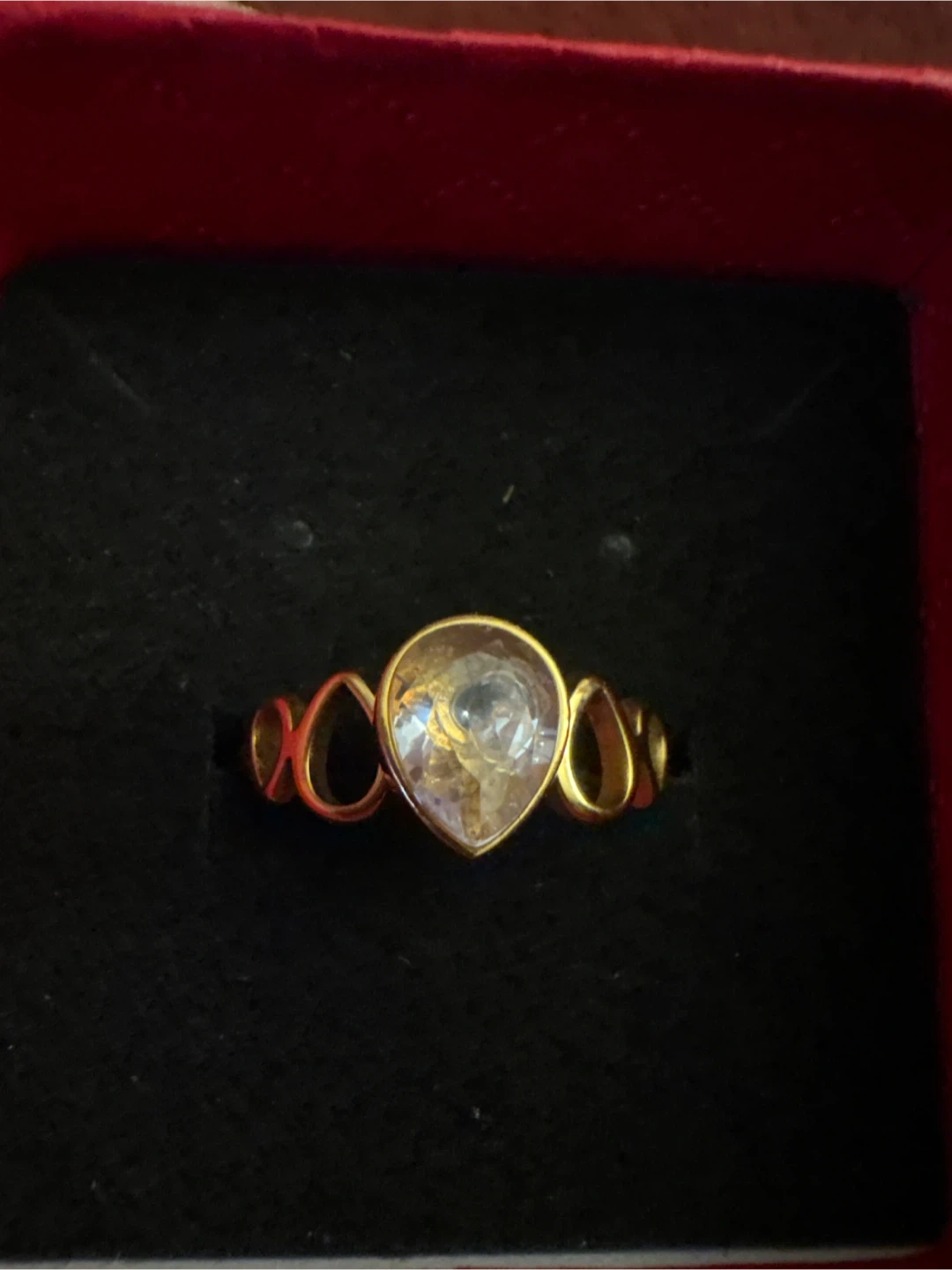 1000+Selling a lovely 18 K Stainless Steel gold ring featuring a teardrop-shaped stone. It has a unique design with small loops on either side of the main stone. It's in great condition and ready for a new home!