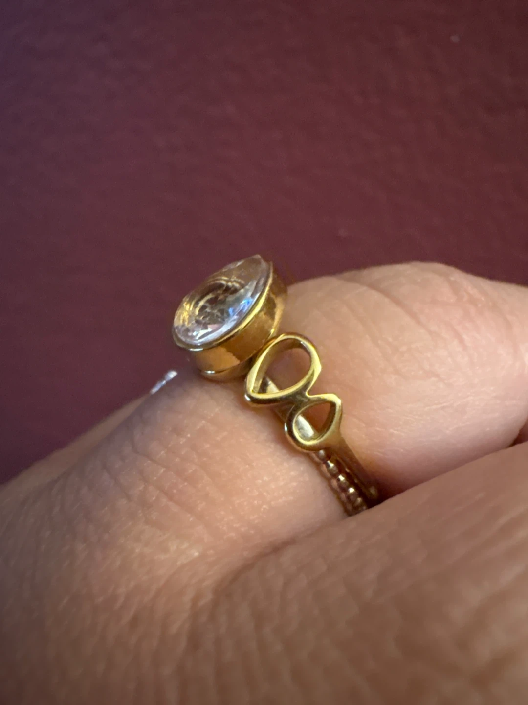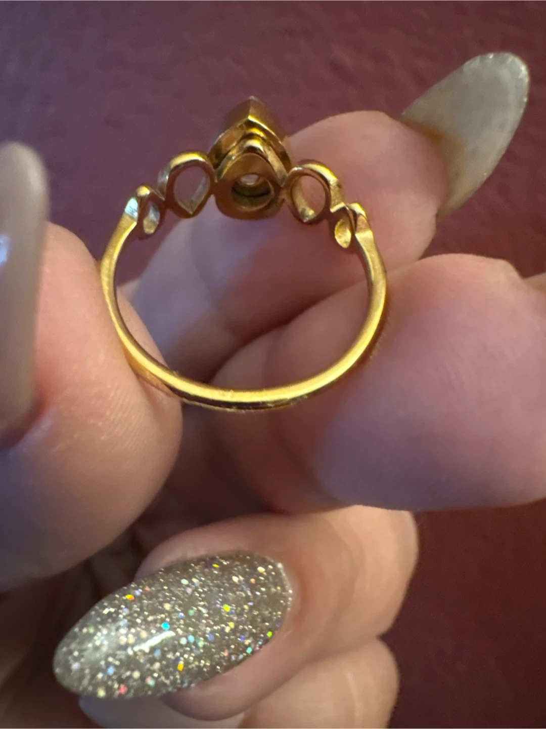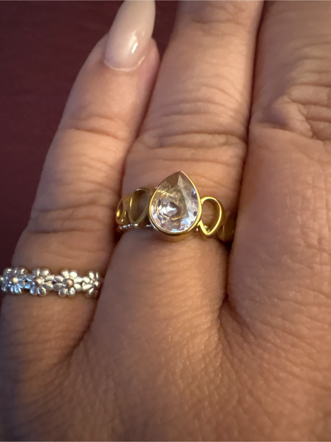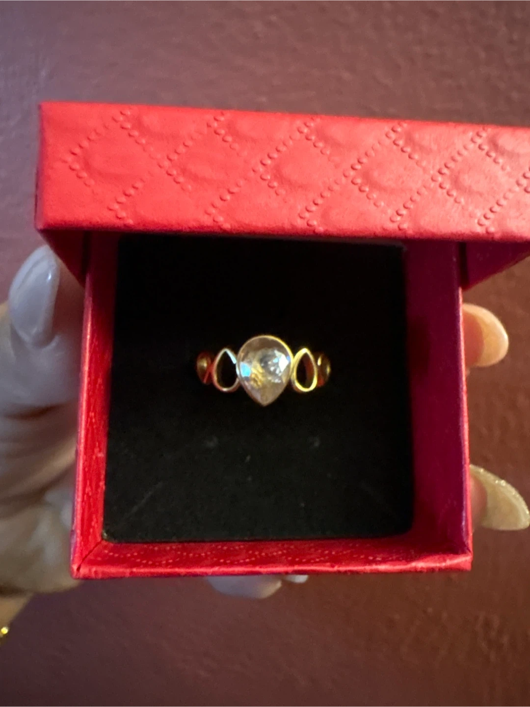 1000+Selling a lovely 18 K Stainless Steel gold ring featuring a teardrop-shaped stone. It has a unique design with small loops on either side of the main stone. It's in great condition and ready for a new home!