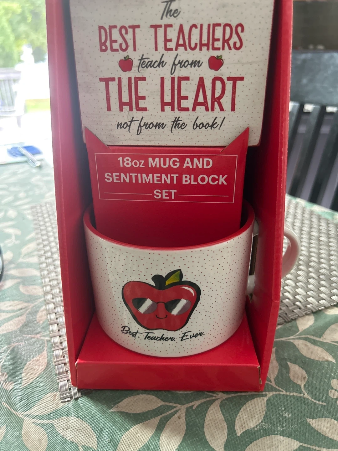 This is an 18oz mug and sentiment block set, perfect as a teacher gift! The set includes a mug and a block with the saying: "The BEST TEACHERS teach from THE HEART not from the book!" The mug features an apple with sunglasses design and says "Best Teacher Ever"! Comes in its original box