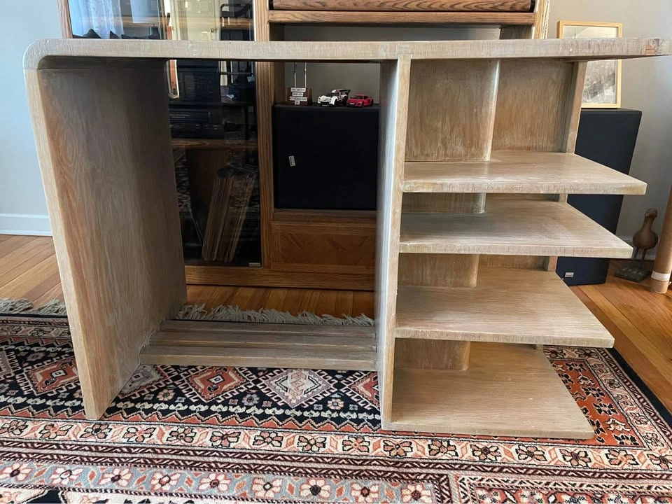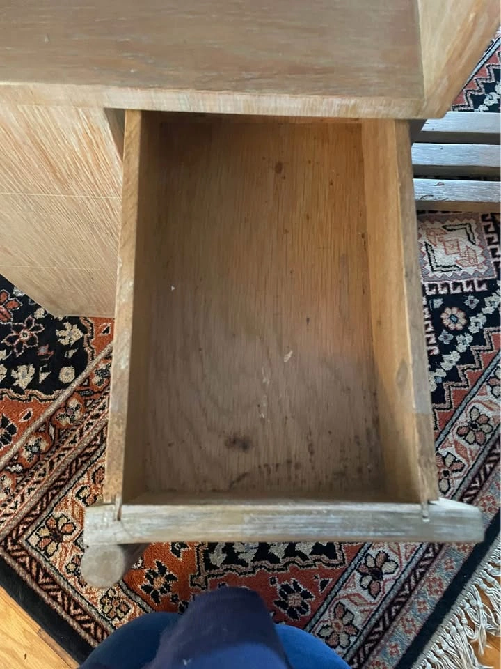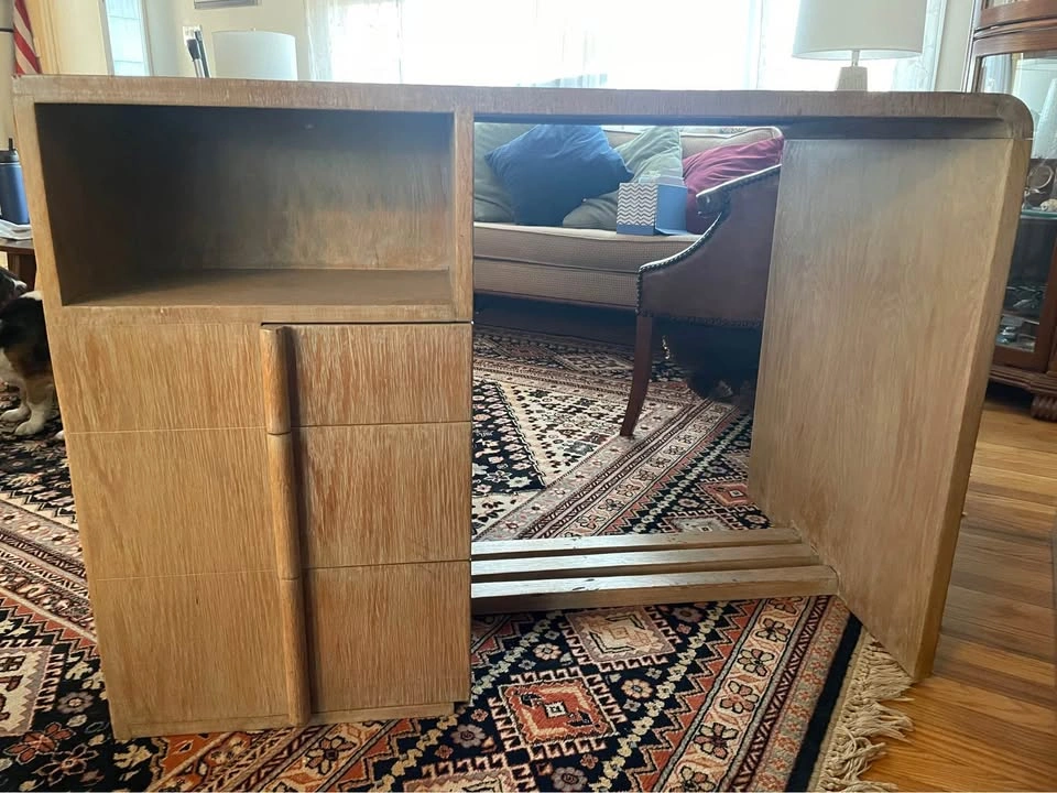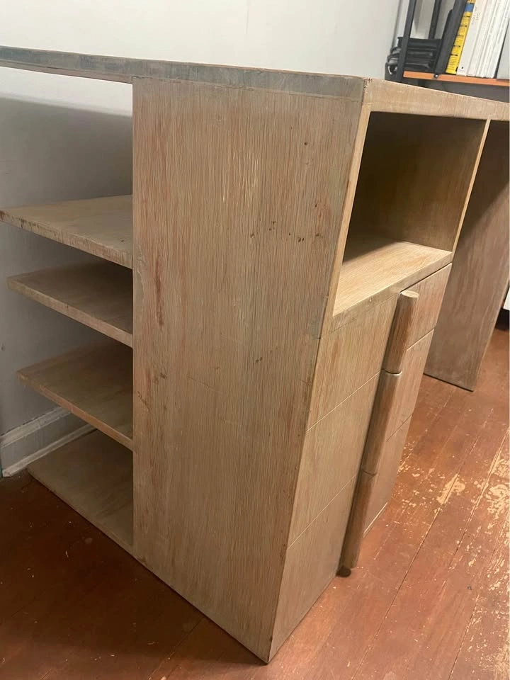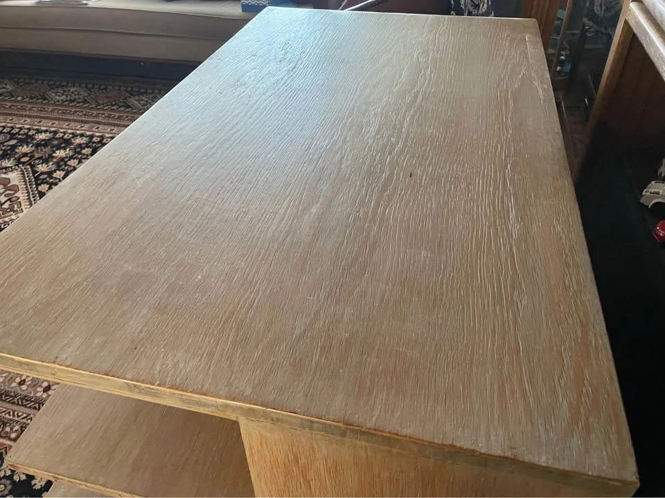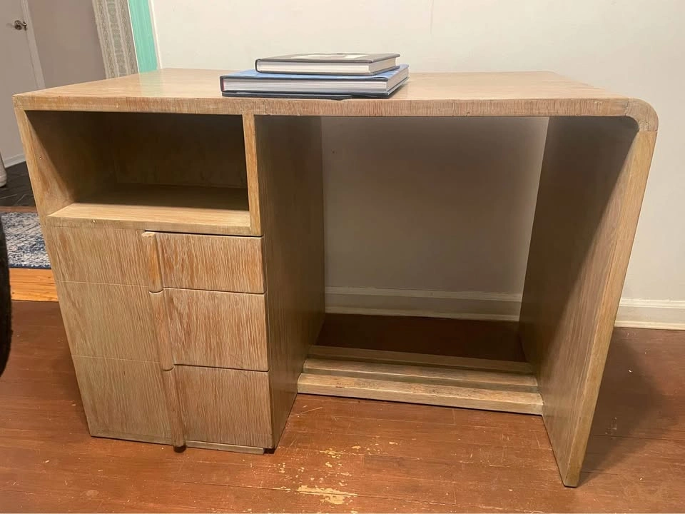The Oak Desk from the 1930s, custom made for Pitt Petri in Buffalo, NY, is a rare find in the world of antiques. This desk, possibly crafted by Anton Raymond, showcases the elegance and style of Mid-Century Modernism with its blond oak finish and sleek design. With its three drawers for storage, this desk is both functional and visually appealing, making it a unique addition to any vintage-loving collector's space. Standing at 30 inches tall, 42 inches wide, and 24 inches deep, this desk is a timeless piece that exudes quality and craftsmanship from a bygone era. The desk was purchased from the Alan Moss Gallery in the 1980's. 42” w x 24” d x 30”h