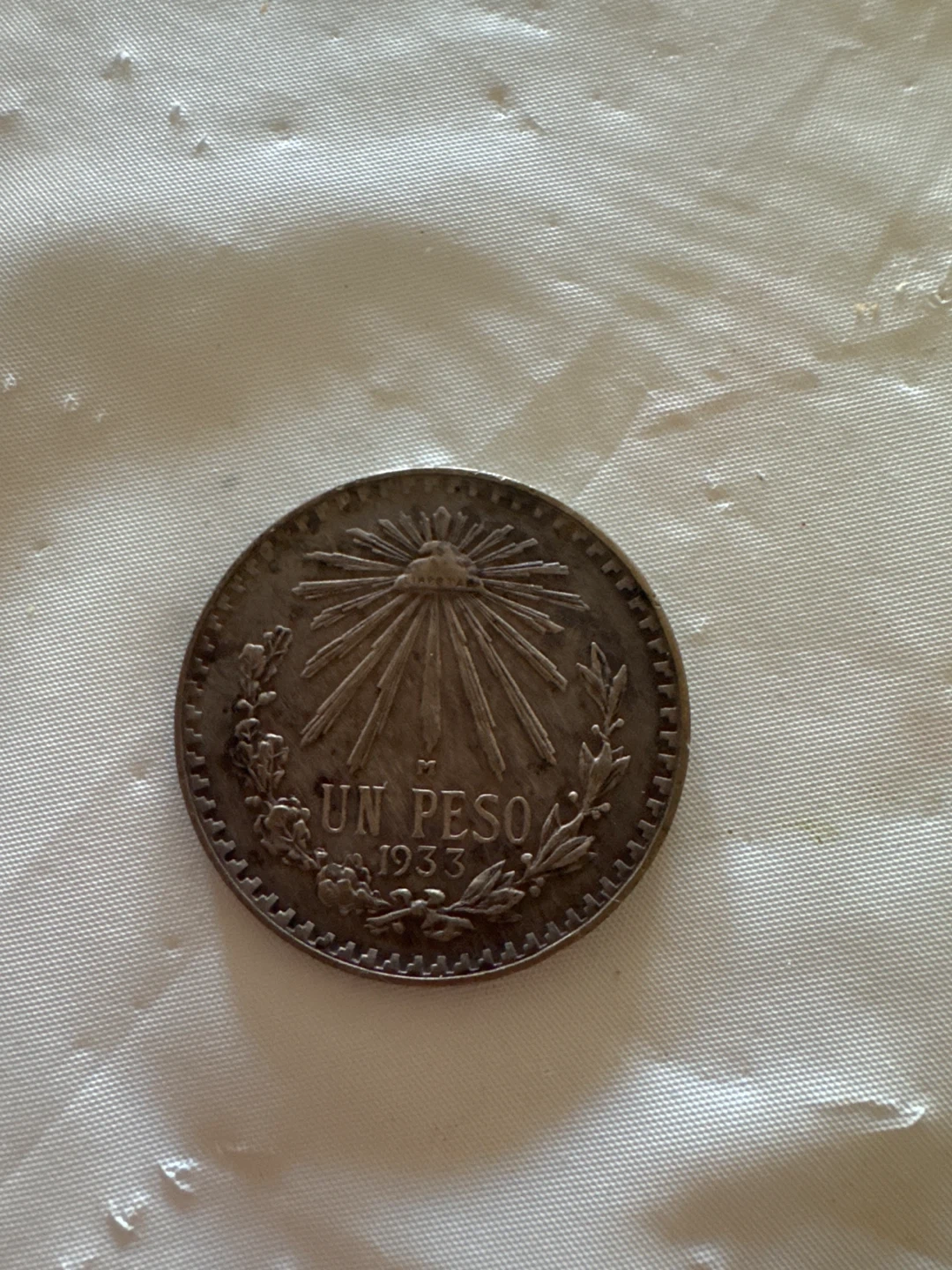 28Selling an Un Peso coin from 1933. It has a unique design with a radiant sun and laurel branches. A piece of history!