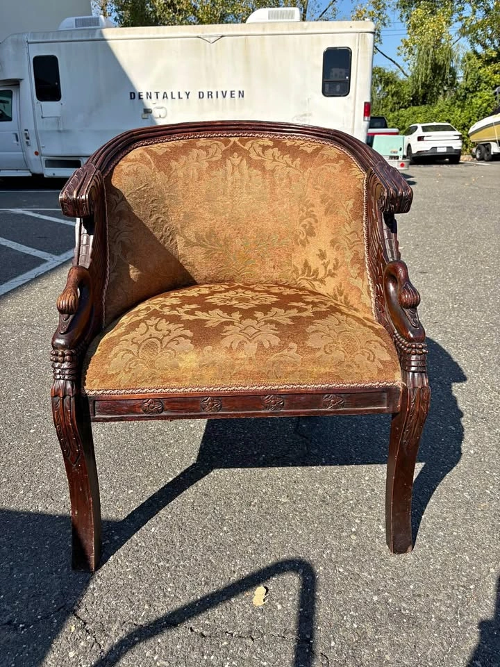 26This rare 1940 Carved Wood Swan Barrel Chair is a stunning example of classic craftsmanship and timeless design. Featuring hand-carved swan armrests, a solid hardwood frame, and elegant gold damask upholstery, this chair captures the artistry and sophistication of early 20th-century furniture making. Whether placed in a formal living room, study, or as a statement accent in a boutique or office, this piece radiates vintage luxury and charm. Details: Authentic circa 1940 craftsmanship Hand-carved swan armrests with exquisite detailing Solid wood frame with warm, rich patina Barrel-back design for comfort and visual elegance Upholstered in textured gold damask fabric Approx. dimensions: 30” H × 26” W × 24” D Condition: Excellent vintage condition — sturdy frame, clean upholstery, and only minor signs of age. The carved swans and ornate frame remain in exceptional shape. Why Collectors Love It: Original swan barrel chairs from this period are increasingly rare and highly sought after by designers and collectors. This chair is both a functional piece of art and an investment in timeless design. Price: 💲1,200 Pickup in: Port Washington, NY Local pick up, or delivery anywhere in Nassau County for $50. Ask about other locations in the tristate area