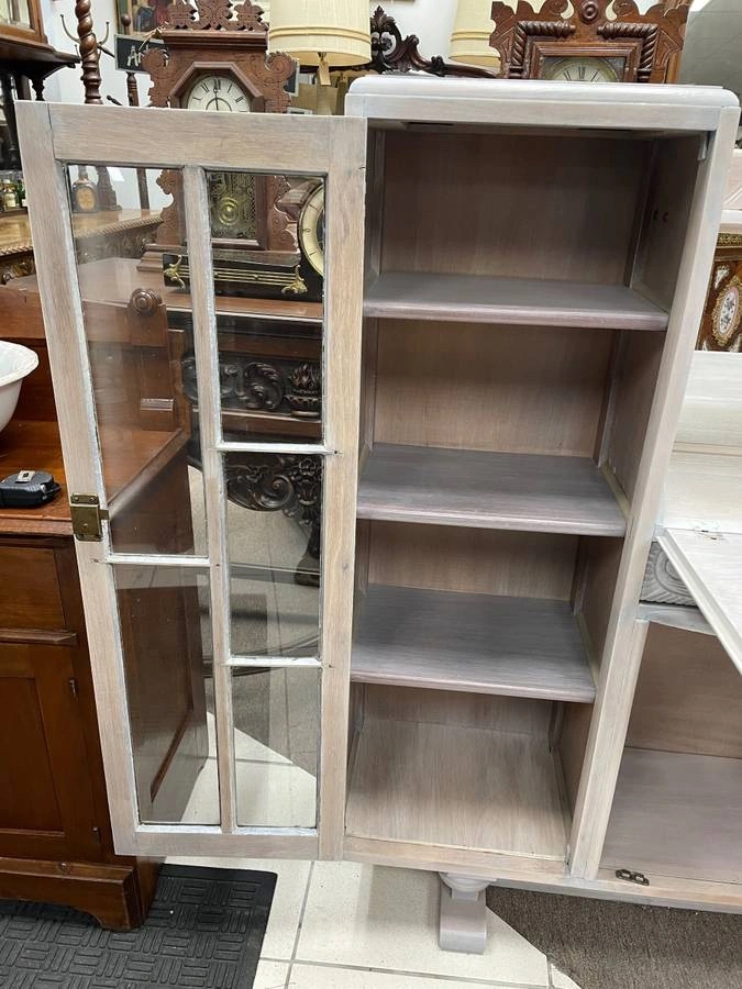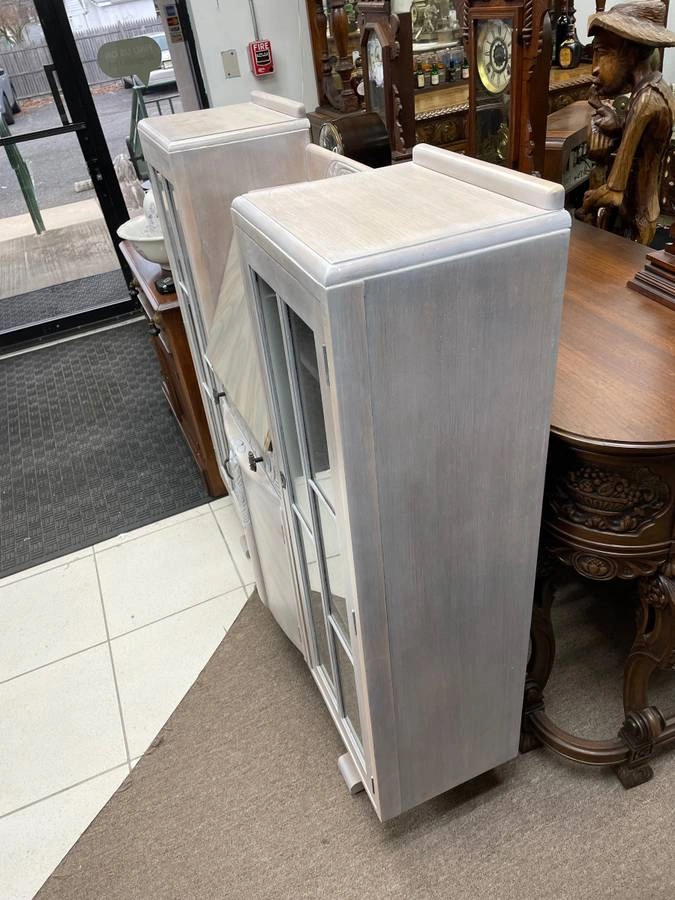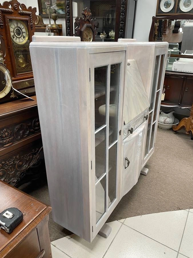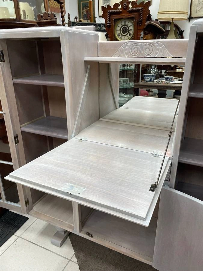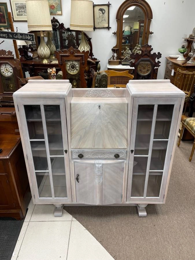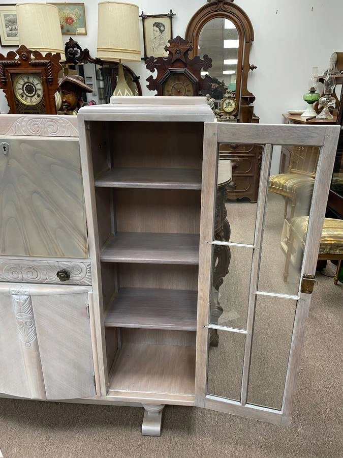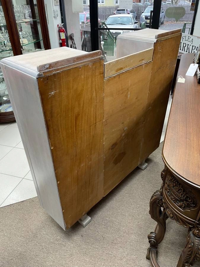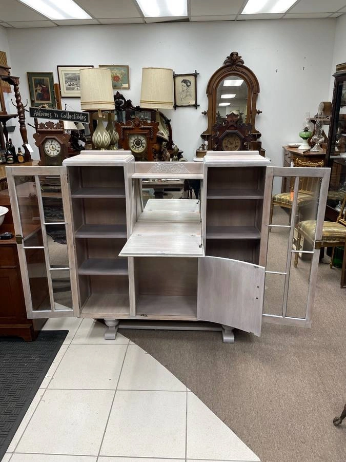 10Micalizzi Antiques and Furniture Restoration, Phone: (732-490-5700). Located on 28 Harrison avenue Building #9 Englishtown New Jersey. Hours: Monday - Friday 9-4, Saturday 10-3. Antique Mirrored Flip down style desk cabinet from the 1940's. Its made from authentic tiger oak wood and has recently been restored. The center cabinet flips down revealling a desk space along with a mirrored backing. Below that is a small drawer and a center cabinet. On each side is an outward opening glass door shelved unit, each with three shelves. These doors both have a working lock and original key. The same key fits into the desk door on top but that lock does not seem to work. Beautiful uniquely finsihed piece that proves verp practical and decorative. It measures 48L x 13W x 49H. Delivery is available within a certain distance. Check out our other listings as well! Something for everyone!