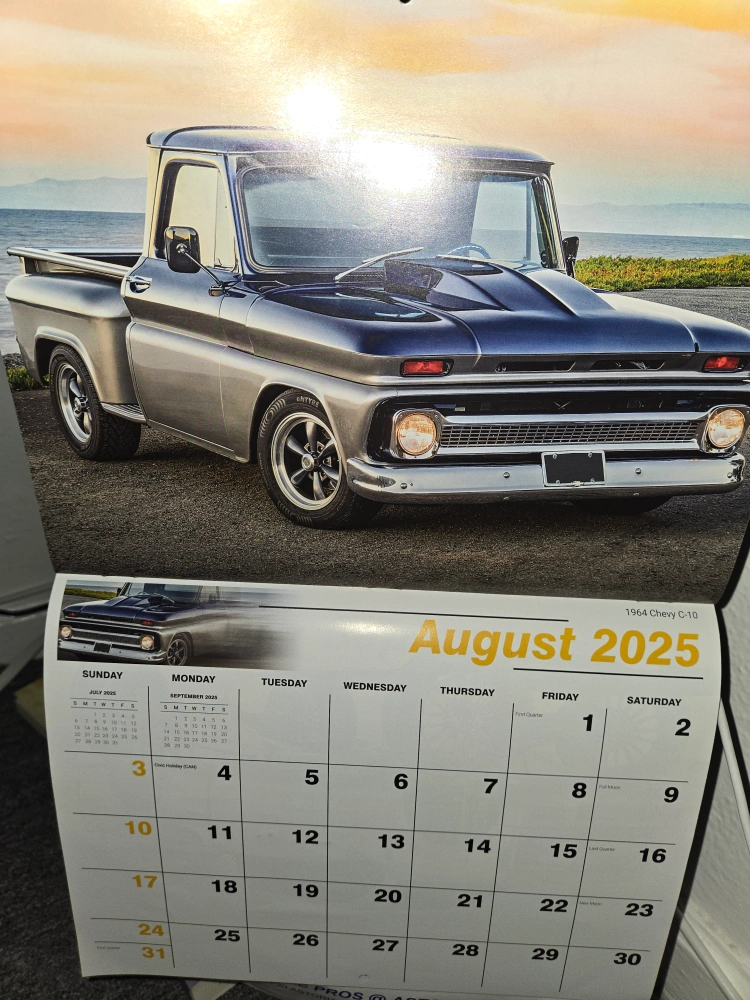 Here's a calendar featuring a classic 1964 Chevy C-10 truck, specifically the August 2025 page. It's perfect for any vintage car enthusiast!