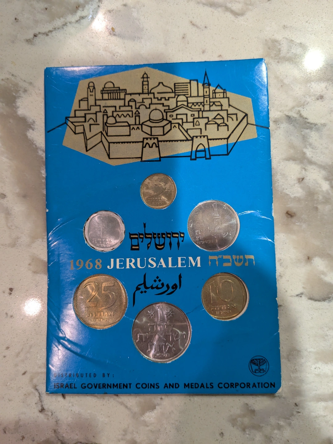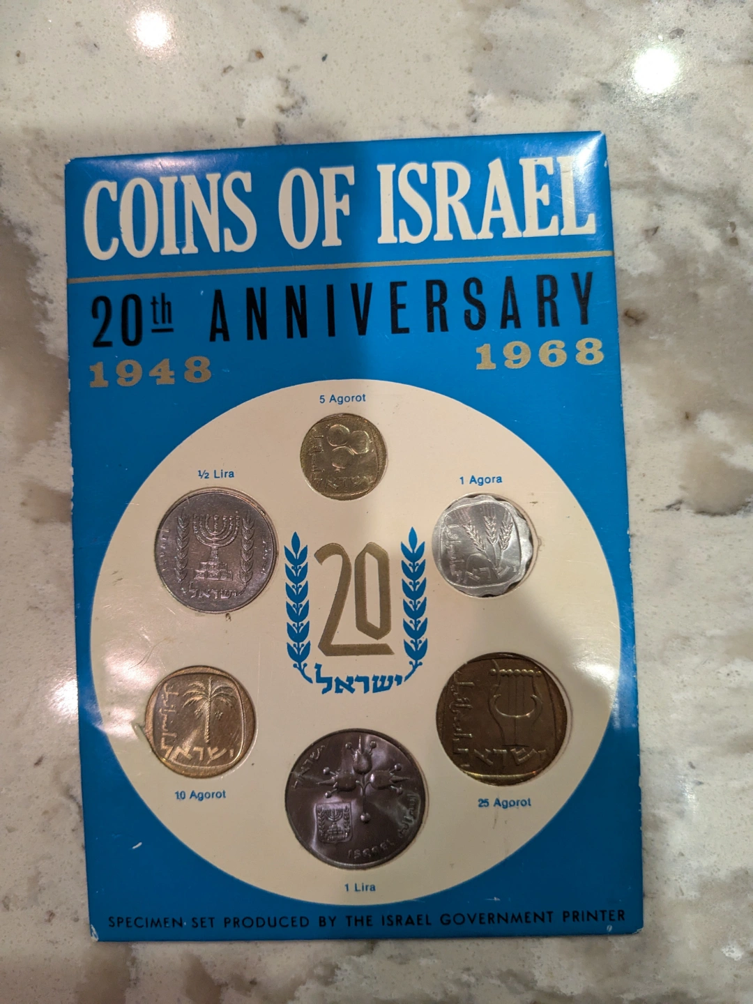 Vintage coin set. Contains Israeli coins. Issued in 1968 to commemorate the 20th anniversary. Distributed by the Israel Government Coins and Medals Corporation. Specimen set produced by the Israel Government Printer.