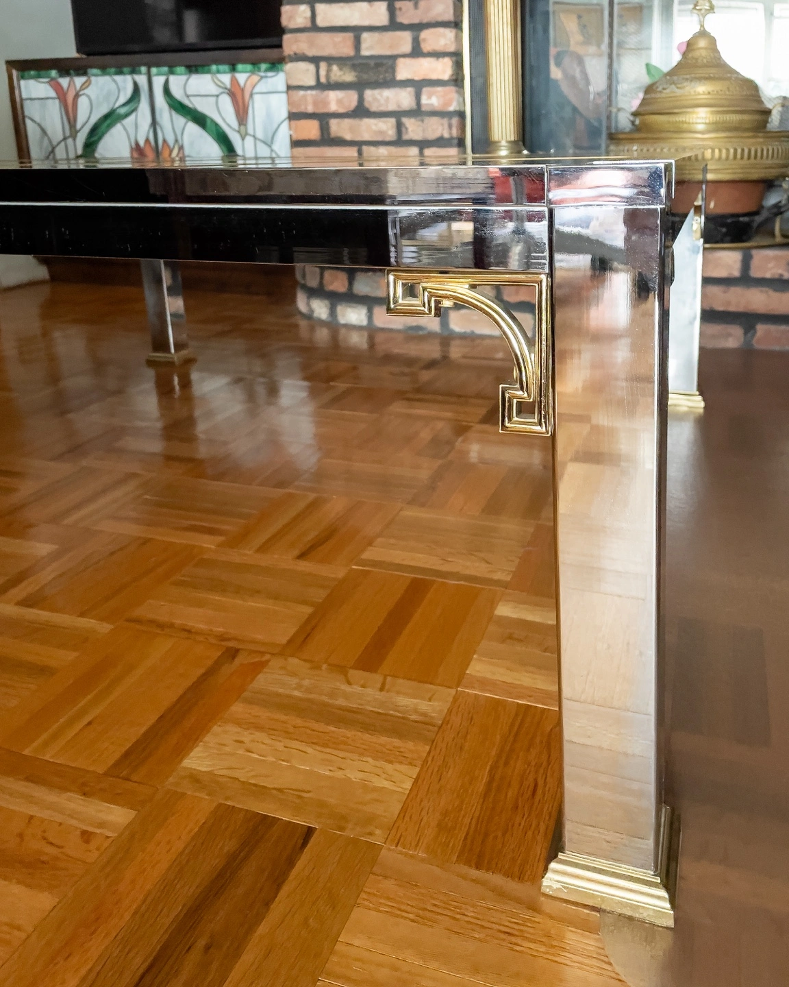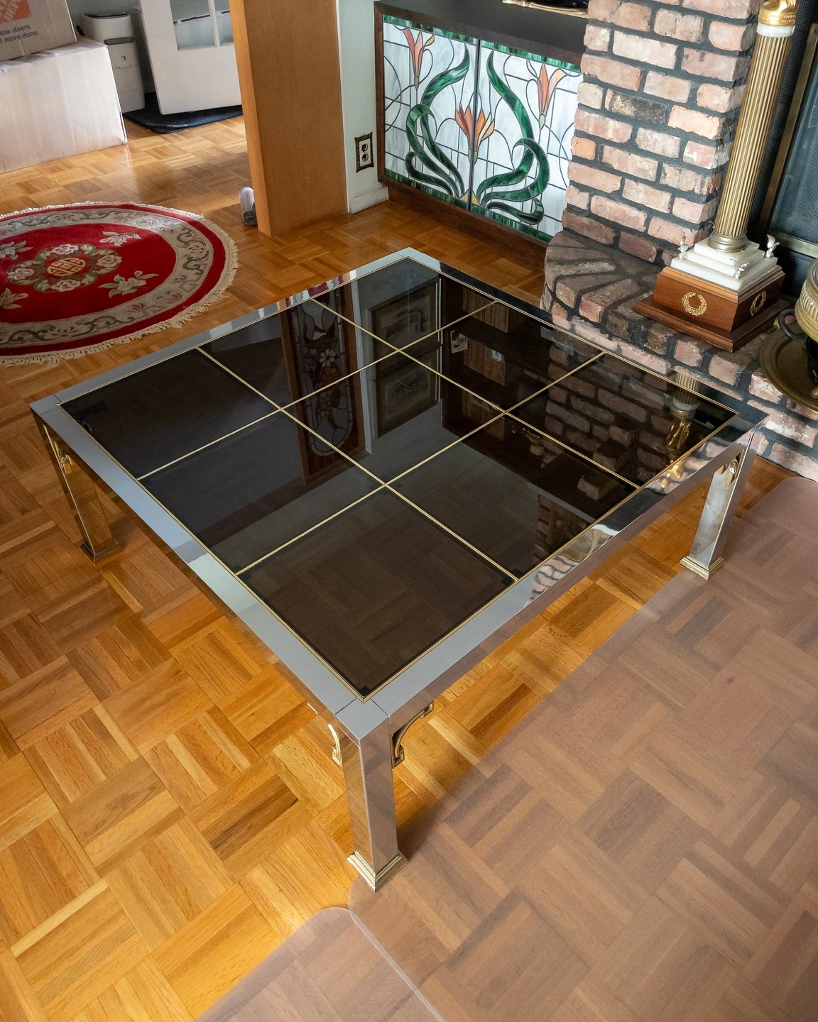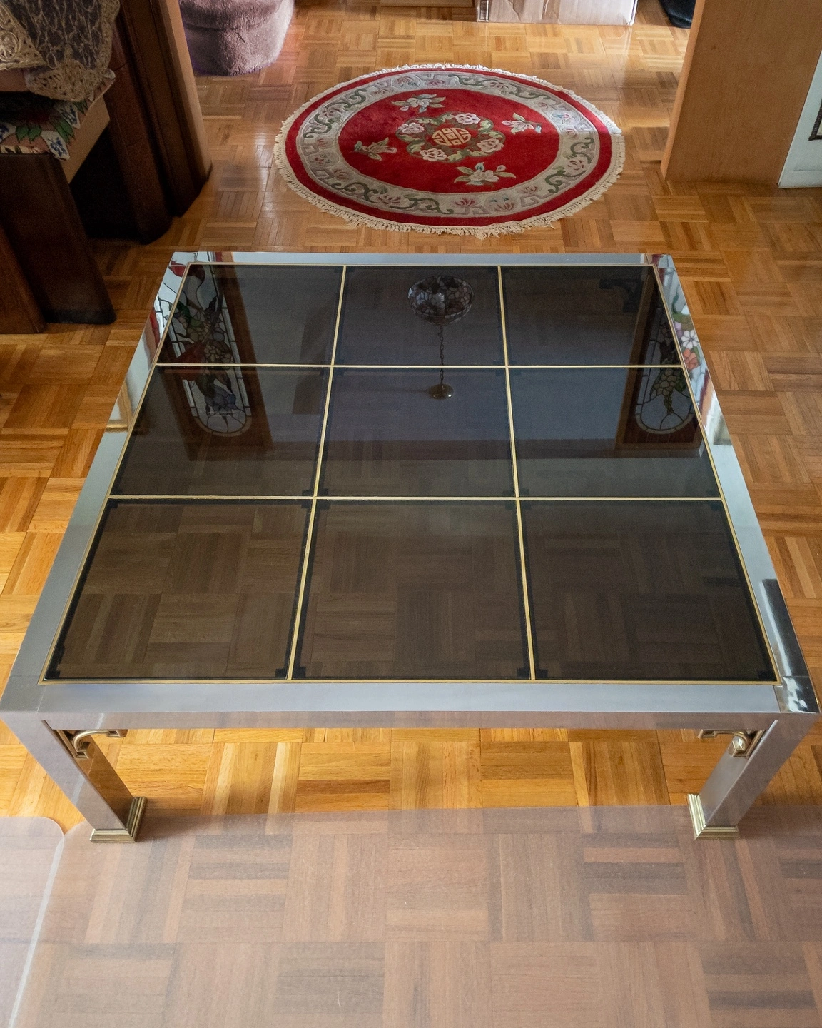 Vintage Italian coffee table, in a beautiful chrome design with tinted black glass and gold accents throughout. There are some faint scratches on the chrome consistent with age and use. Measures 16" H x 39.75" W x 39.75" D.