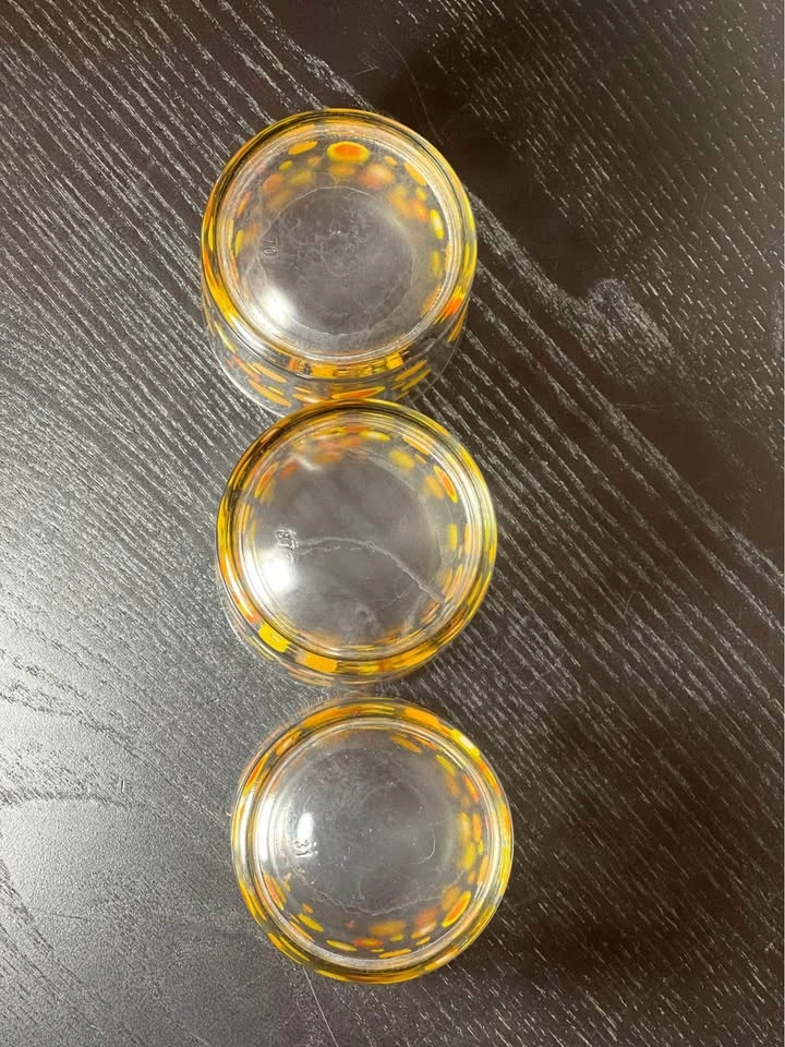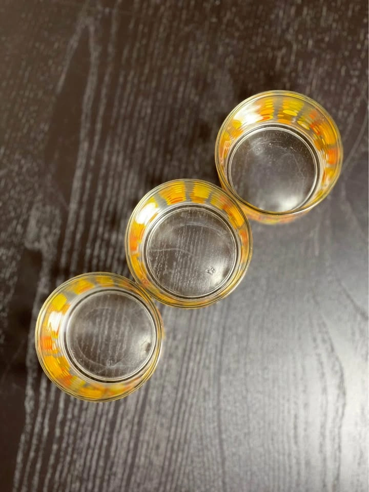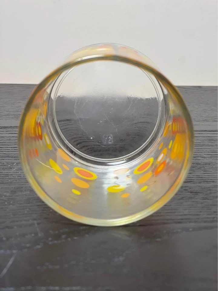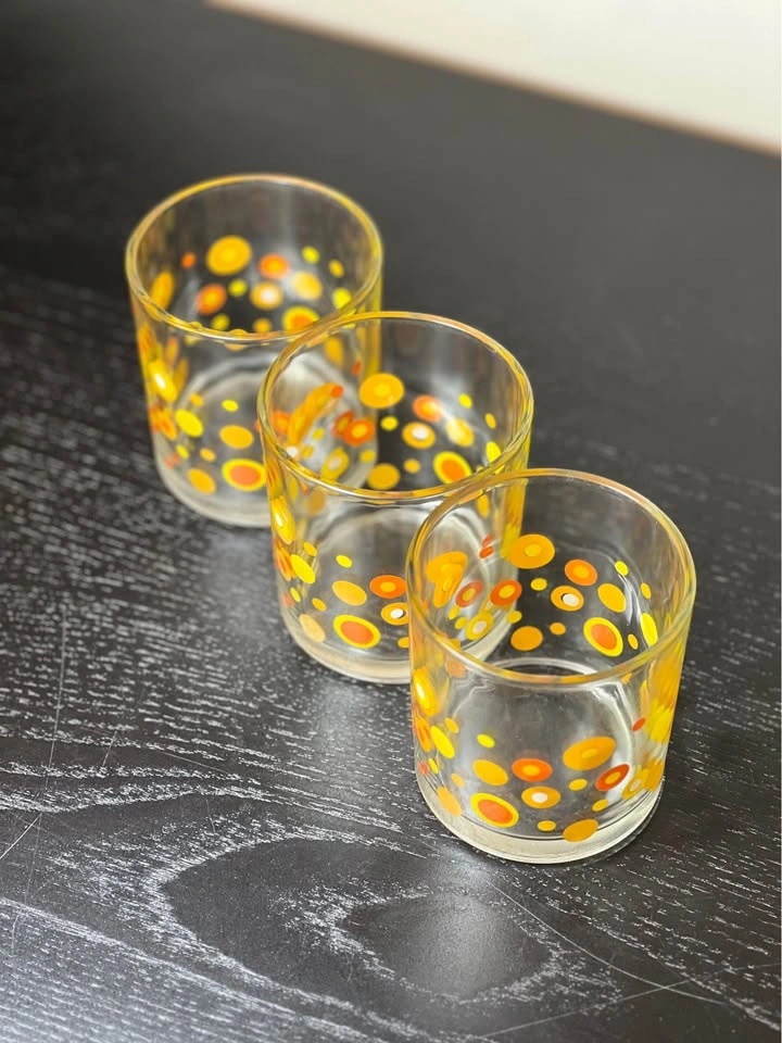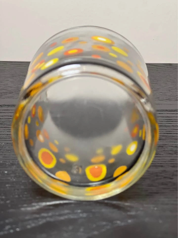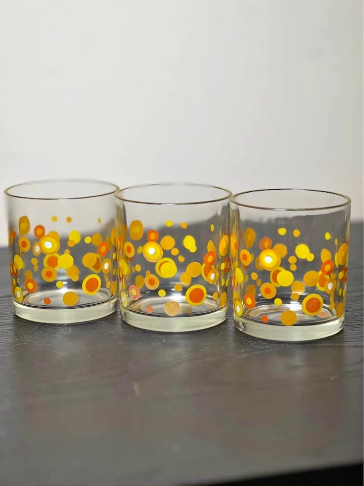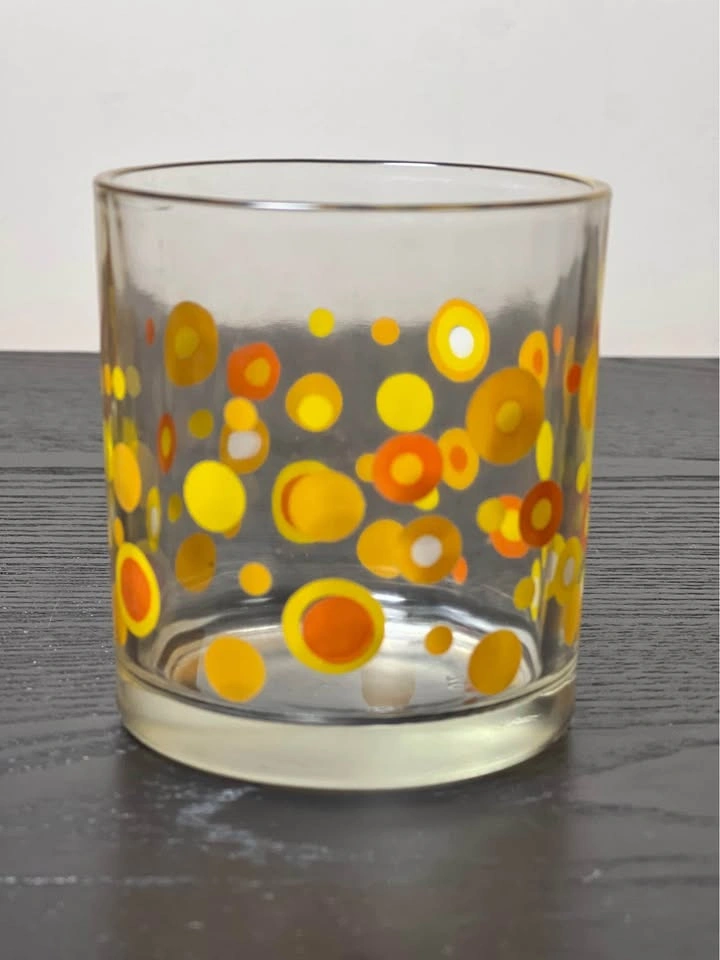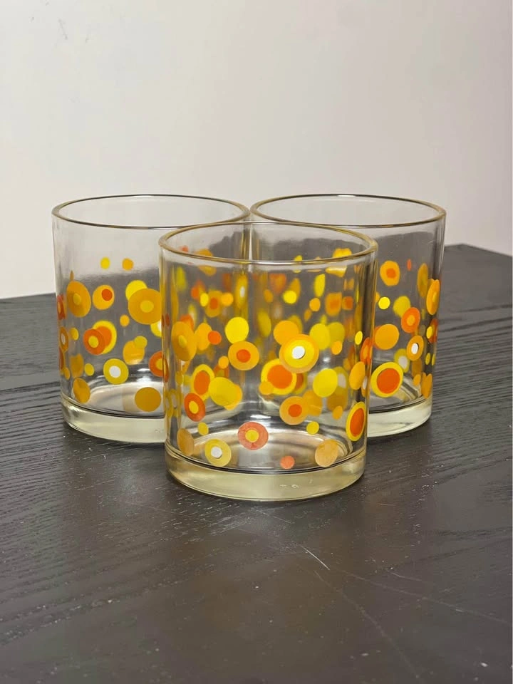 98Vintage Mid-Century Modern (MCM) polka dot drinking glasses, typically attributed to the Libbey glass company. They feature a retro pattern of orange, yellow, and white circles or "dots" and were popular in the 1960s and 1970s. The glasses feature a bright, mod pattern of circles in various sizes and shades of orange and yellow. They are characteristic of Mid-Century Modern design, specifically popular during the 1960s and 1970s "Flower Power" era. The design is often associated with the Libbey brand, which produced similar "Vintage Dots" and "Harvest Dots" patterns. Other potential manufacturers for similar styles include Federal Glass or Hazel-Atlas, although the specific pattern here most closely matches Libbey's style. Used - Sold as is