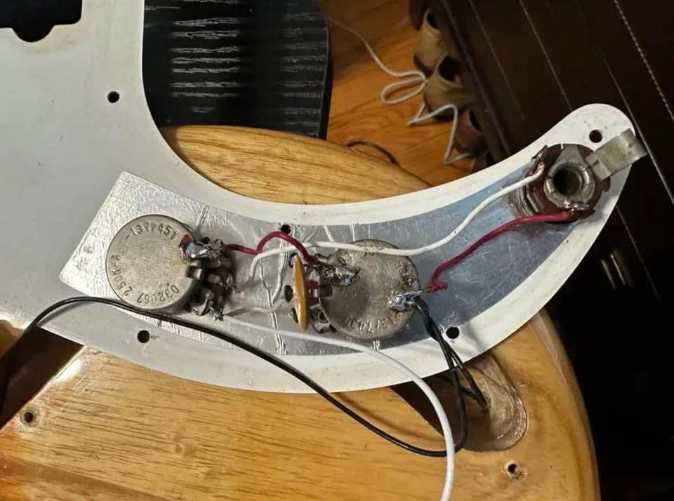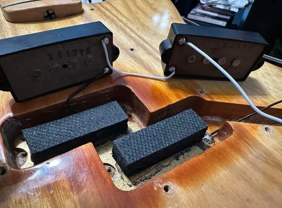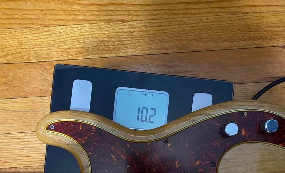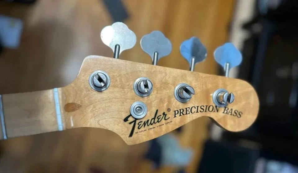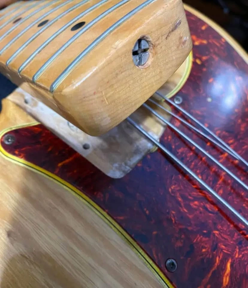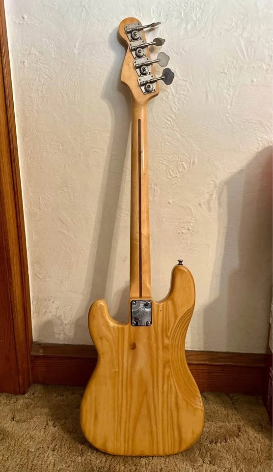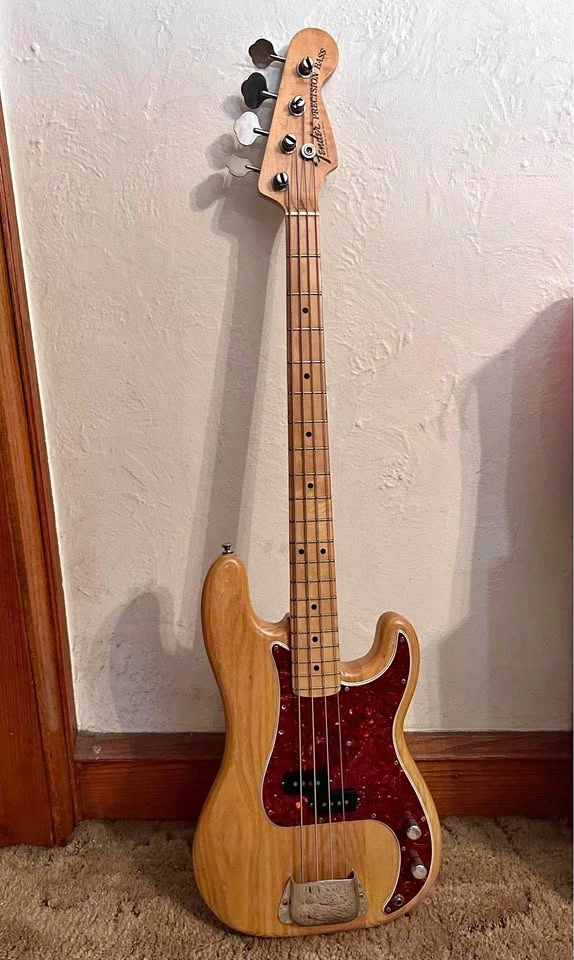 15For your consideration is my 1975 Fender Precision Bass. This bass is all original, including electronics, hardware, and vintage ‘75 pickups; however I did replace the gassed off black pickup cushions which were all but non-existent. I also changed out the black pickguard that came with it (not certain that it was original or not, but looks to be either authentic Fender or Vintage Mighty Mite) for a real cellulose Tortoise one, but will include the original black one. Also has the original chrome bridge cover, which will also be included. It looks as though the tone pot was changed in maybe ‘76 or ‘77, because that pot is dated “137-76-07”, versus the volume pot which is dated “137-74-51”. The capacitor and wiring are both original. The neck plate serial number of 648451 places the bass solidly in the realm of 1975 (580000 to 690000). There is no discernable date stamp on the neck heel—a tiny bit of unreadable ink shows where the date stamp would typically start—but there are authentic QC stamps on the bottom, one being that of a Mr. Webright. The neck is straight with no dead spots or ski sloping in the upper register; frets need a good crowning but have plenty of life left in them. There are a couple of small nicks that somehow typically show up on the back of vintage bass necks—I’m guessing from leaning them against amps back in the day before guitar stands or something. The body has its share of vintage apropos expected small nicks and dings; there is a more substantial buckle “dent” on the back of the body which seems to be confined to the finish itself, and not the wood. It of course does not affect the tone or playability of this bass. Surprisingly, there is very little finish checking, as this was the full blown era of Fender’s new “Thick Skin” finishes that were still sometimes covered with a lacquer top coat. This is why as far as I know, even some ‘70s Fenders finishes still check like lacquer finishes. The bass weighs in at 10.2 lbs, which is not the worst weight for that era. But she also balances well and doesn’t really feel heavy IMHO. Pricing includes a new hard shell G&G case.