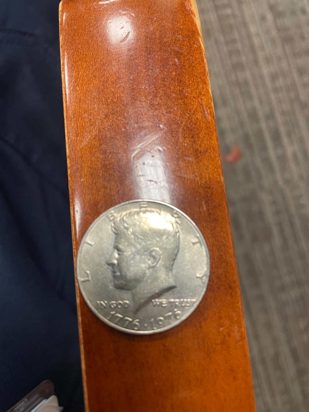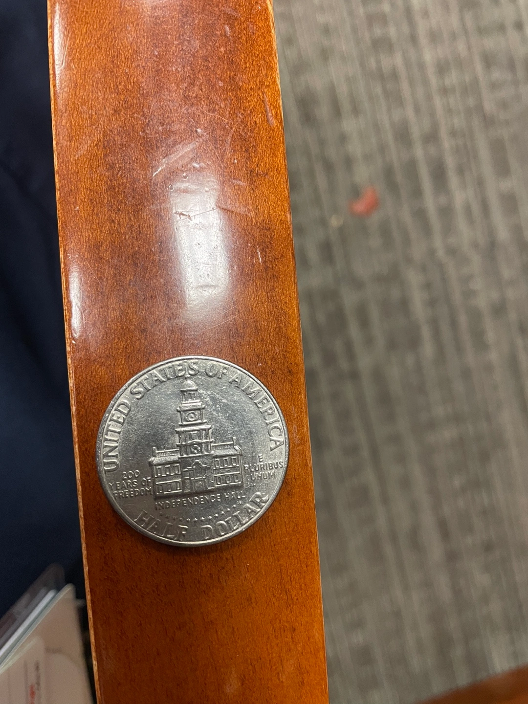 United States Bicentennial half dollar coin. Shows John F. Kennedy on one side and Independence Hall on the other. Obverse reads 'In God We Trust'. Reverse shows '1776-1976'.