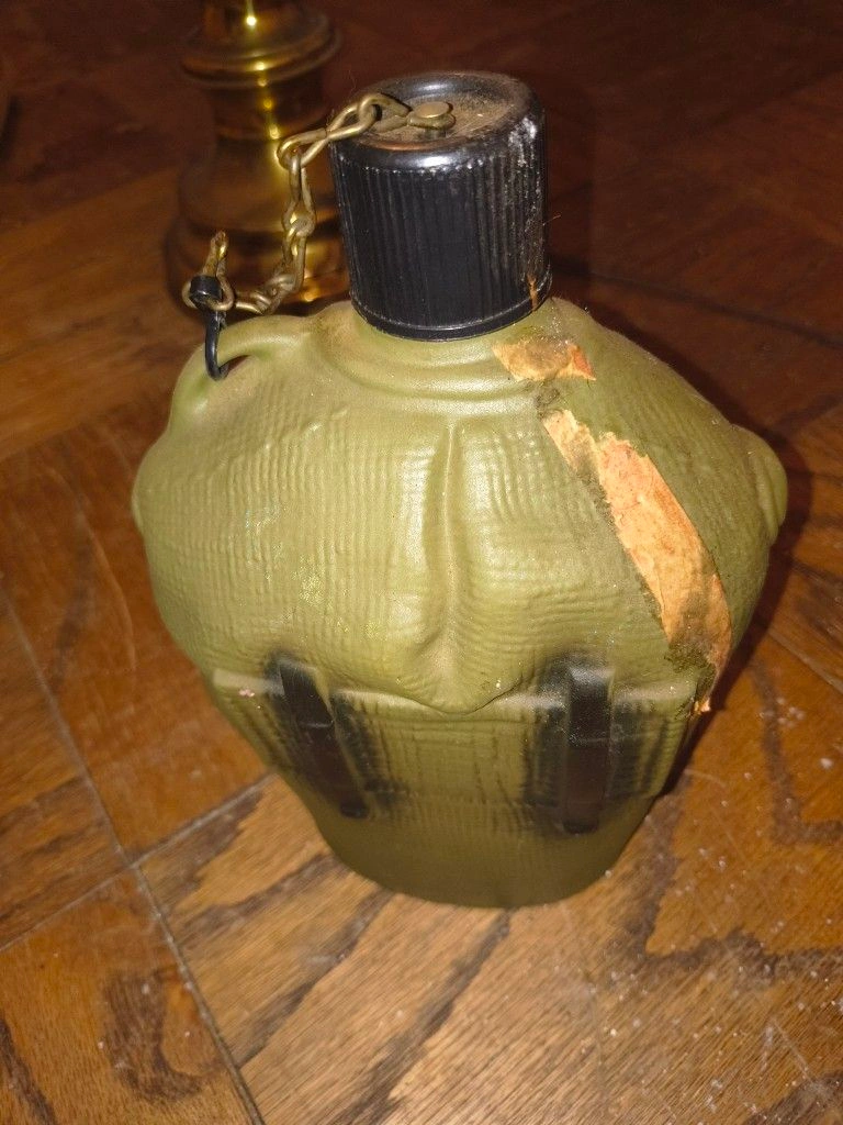 01979 Jim Beam US Army canteen shaped empty liquor decanter with Army green faux canvas textured exterior with top black plastic screw top (top has top to bottom vertical crack per photo) with two faux snap front and faux back belt loop. Decanter has wear/tear, finish loss, stains, cracked top cap and measures 7 1/2" height by 5 1/2" width by 3" depth.