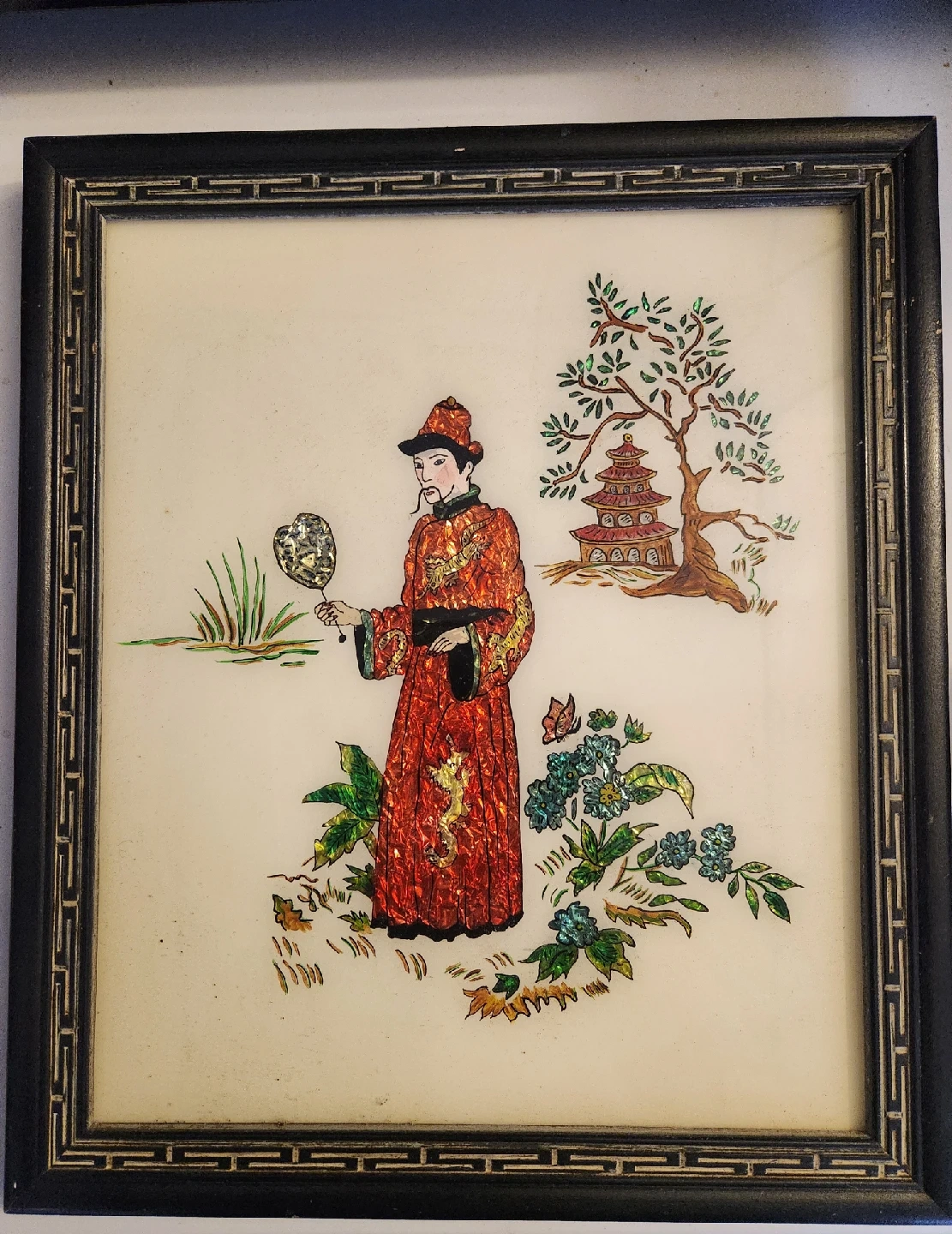 87This is a framed piece of Asian art. It features a man in traditional clothing with a fan, a pagoda, and floral details. It's a unique piece to add to your home decor. Bayside local Artist Ester F. Glendinning.