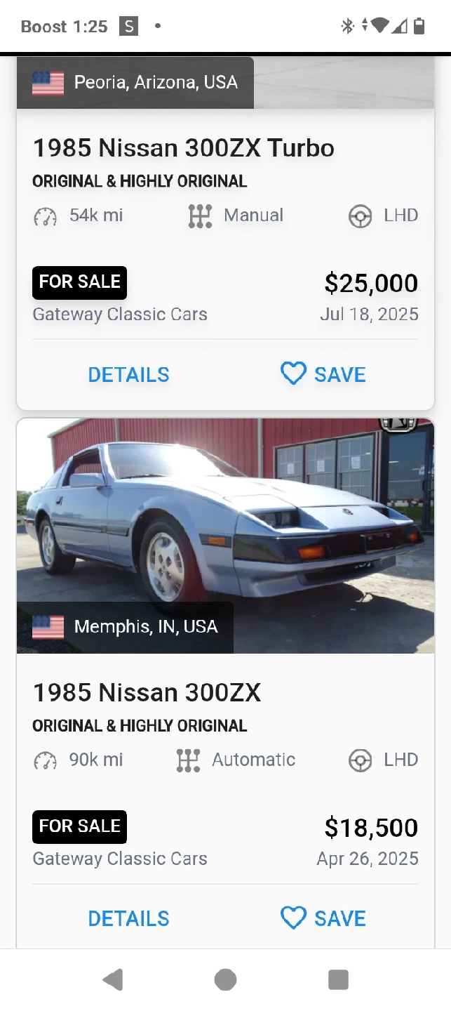 Selling a listing for a 1985 Nissan 300ZX Turbo. It's listed as 'ORIGINAL & HIGHLY ORIGINAL' with 54k miles and a manual transmission. Another listing shows a 1985 Nissan 300ZX with 90k miles and automatic transmission.