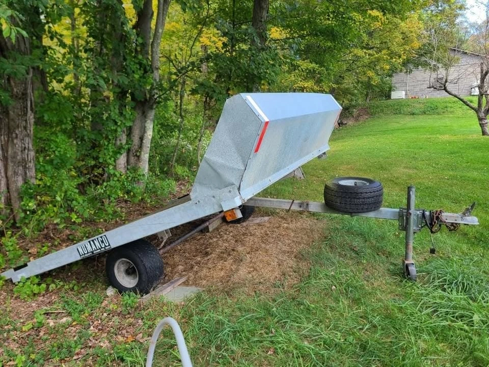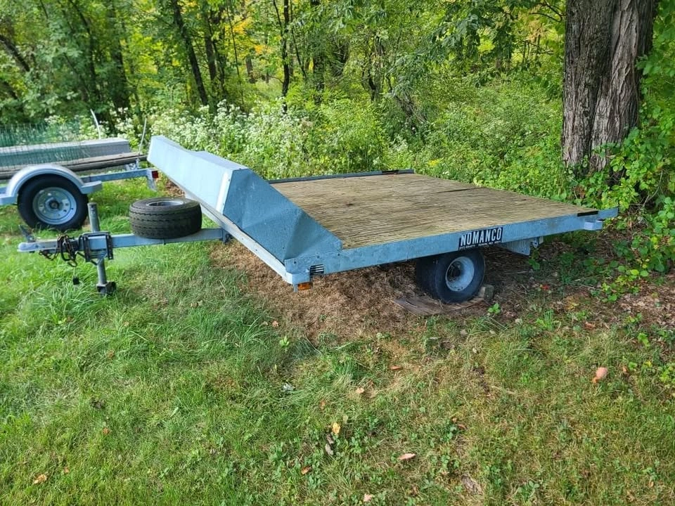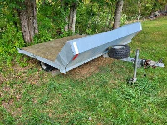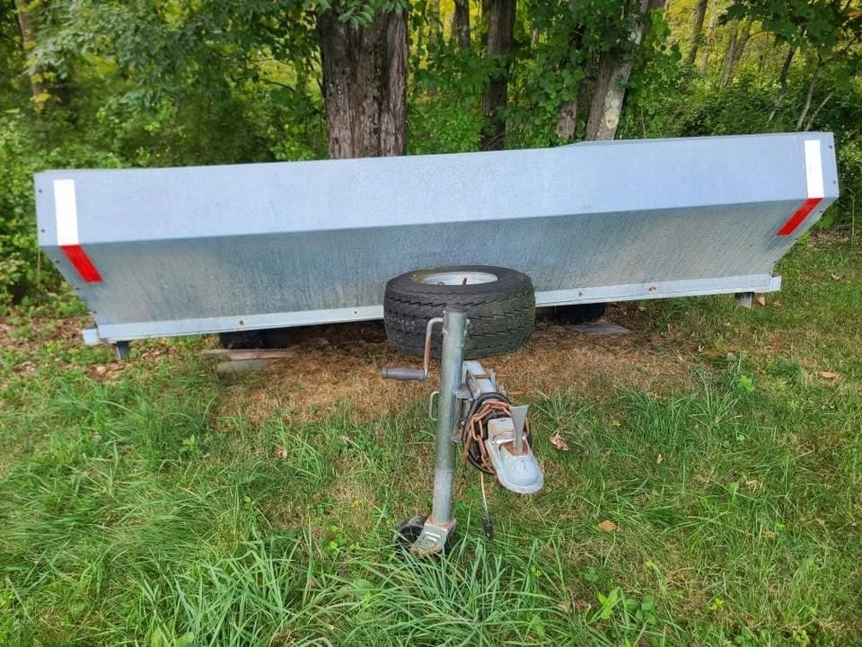 Galvanized, 8 feet long, 7 feet 9 inches wide. Tilts, with slush shield, spare tire, two hold-down bars. Good Condition