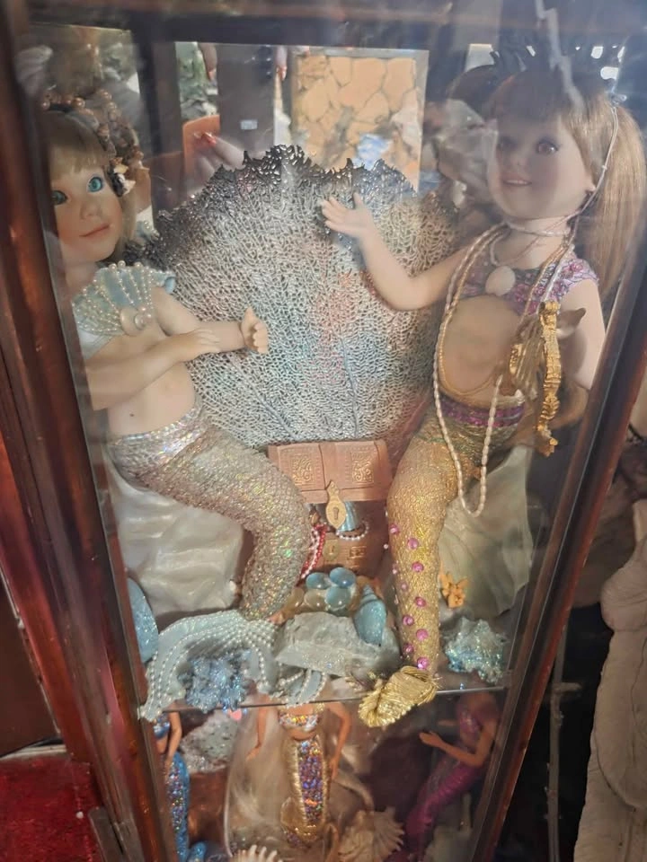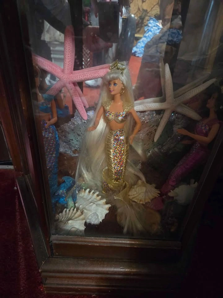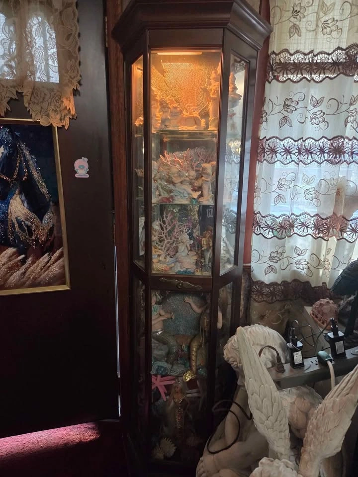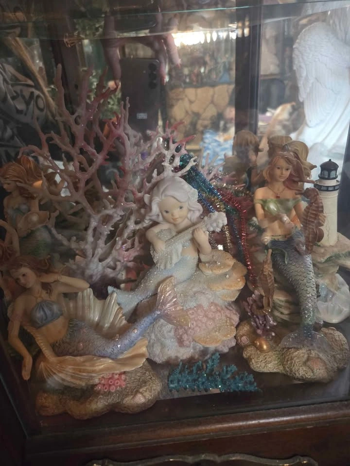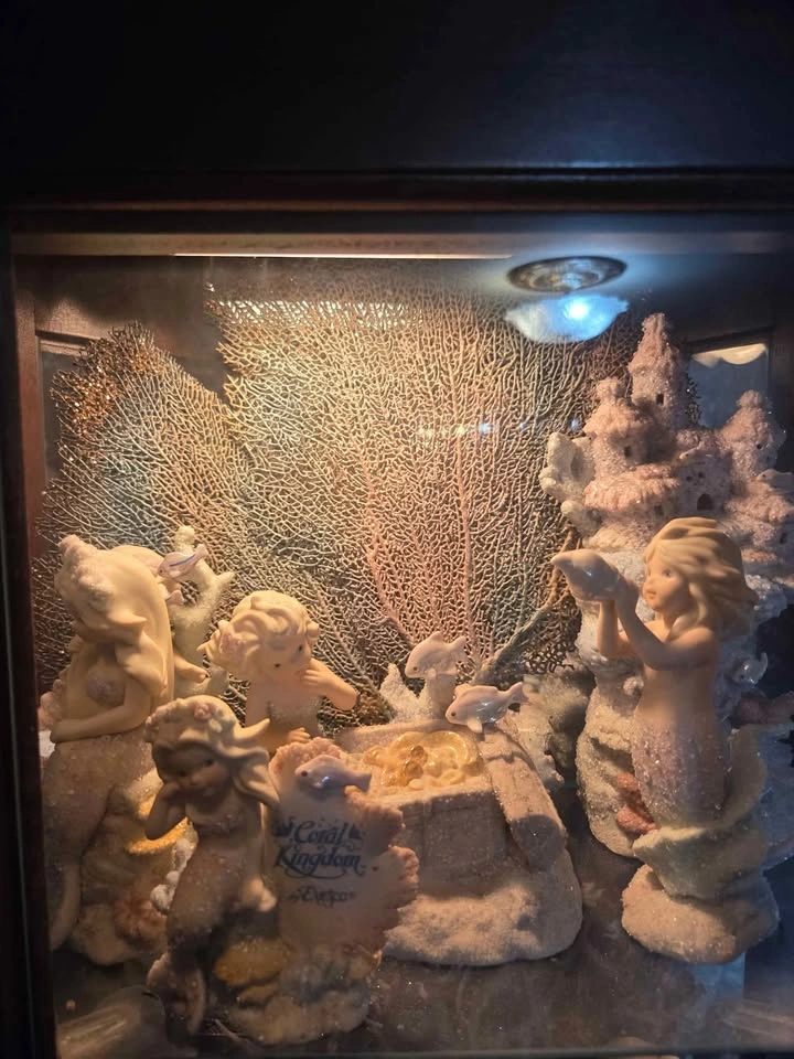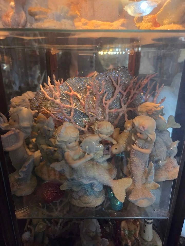 15Beautiful cabinet filled with a collection of Enesco mermaids and barbies. Also 2 porcelain mermaid dolls. Coral and shells throughout. Excellent condition cabinet included.