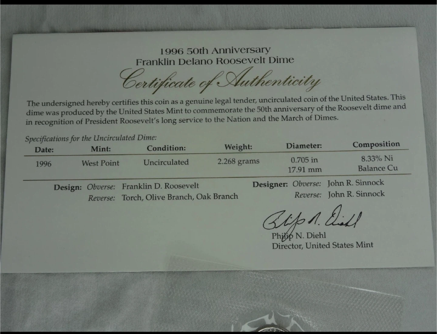 15Selling a 1996 Franklin Delano Roosevelt Dime. It's a 50th Anniversary commemorative coin. The coin is uncirculated, with a weight of 2.268 grams and a diameter of 0.705 inches. It's made of 8.33% Ni and Balance Cu