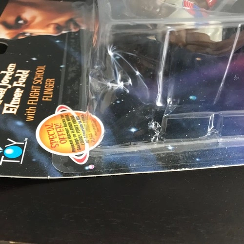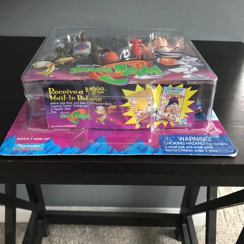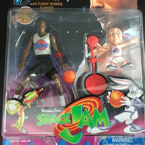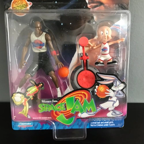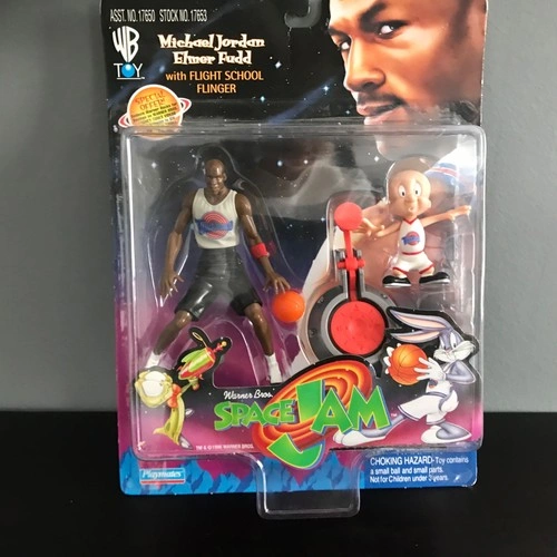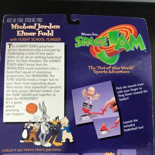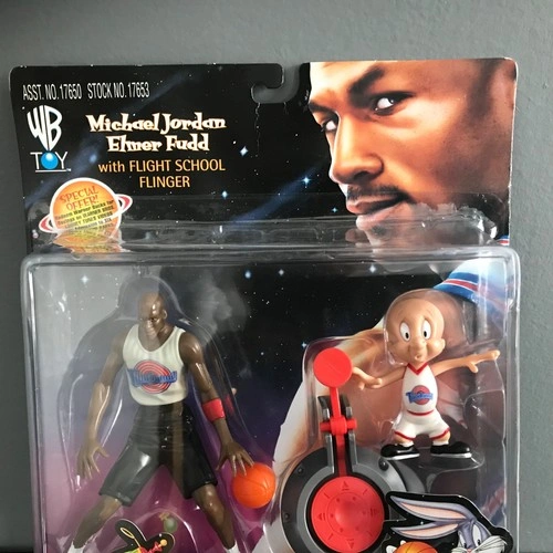 651996 Playmates Space Jam Michael Jordan & Elmer Fudd Flight School Flinger action figure set. This toy set features Michael Jordan and Elmer Fudd characters from the movie Space Jam, and is part of the Bugs Bunny franchise. The figures are brand new in original packaging, making it a collectible item for fans of the movie and toy enthusiasts alike. There is wear to the packaging and plastic has a dent in it. See photos or ask for more.
