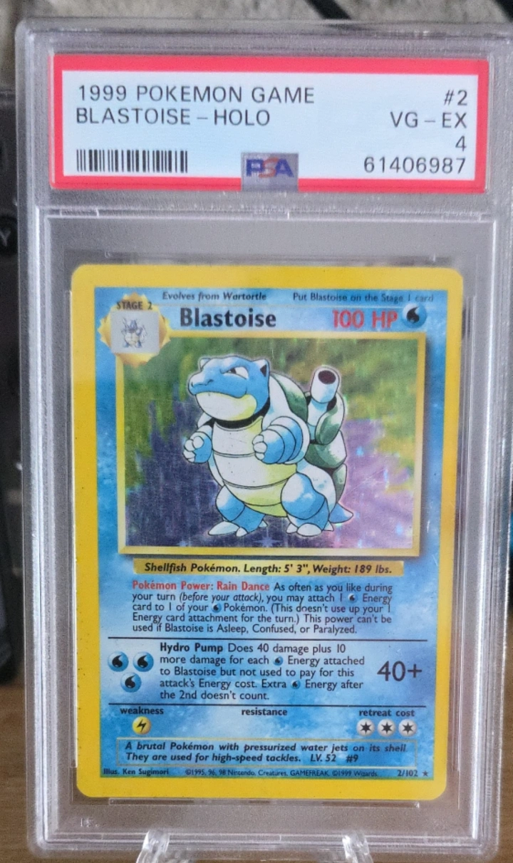 Selling a 1999 Pokemon Game Blastoise Holo card, graded VG-EX 4 by PSA. This card features the iconic Blastoise and is a must-have for any serious collector! The card is encased in a protective PSA holder to preserve its condition.