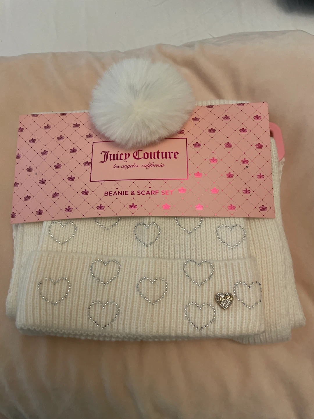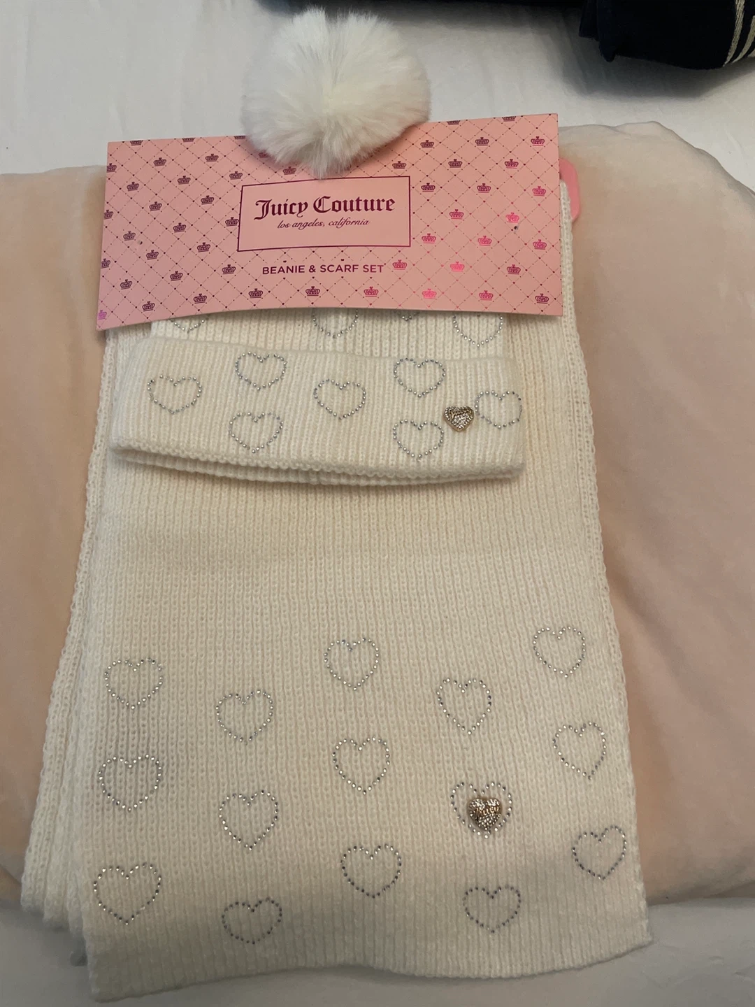Cozy off-white knit beanie and scarf set from Juicy Couture. Features all-over rhinestudded hearts and a fluffy pom on the beanie. Comes with original packaging.