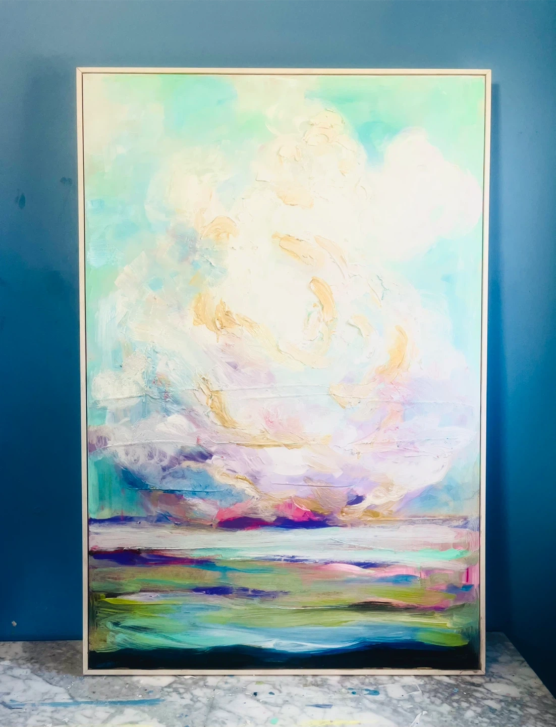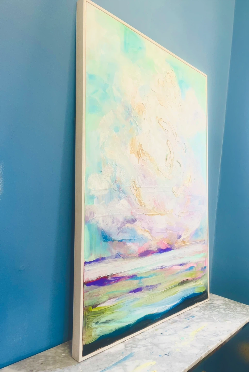 Large abstract painting featuring soft pastel colours. Textured impasto technique used for clouds and water.