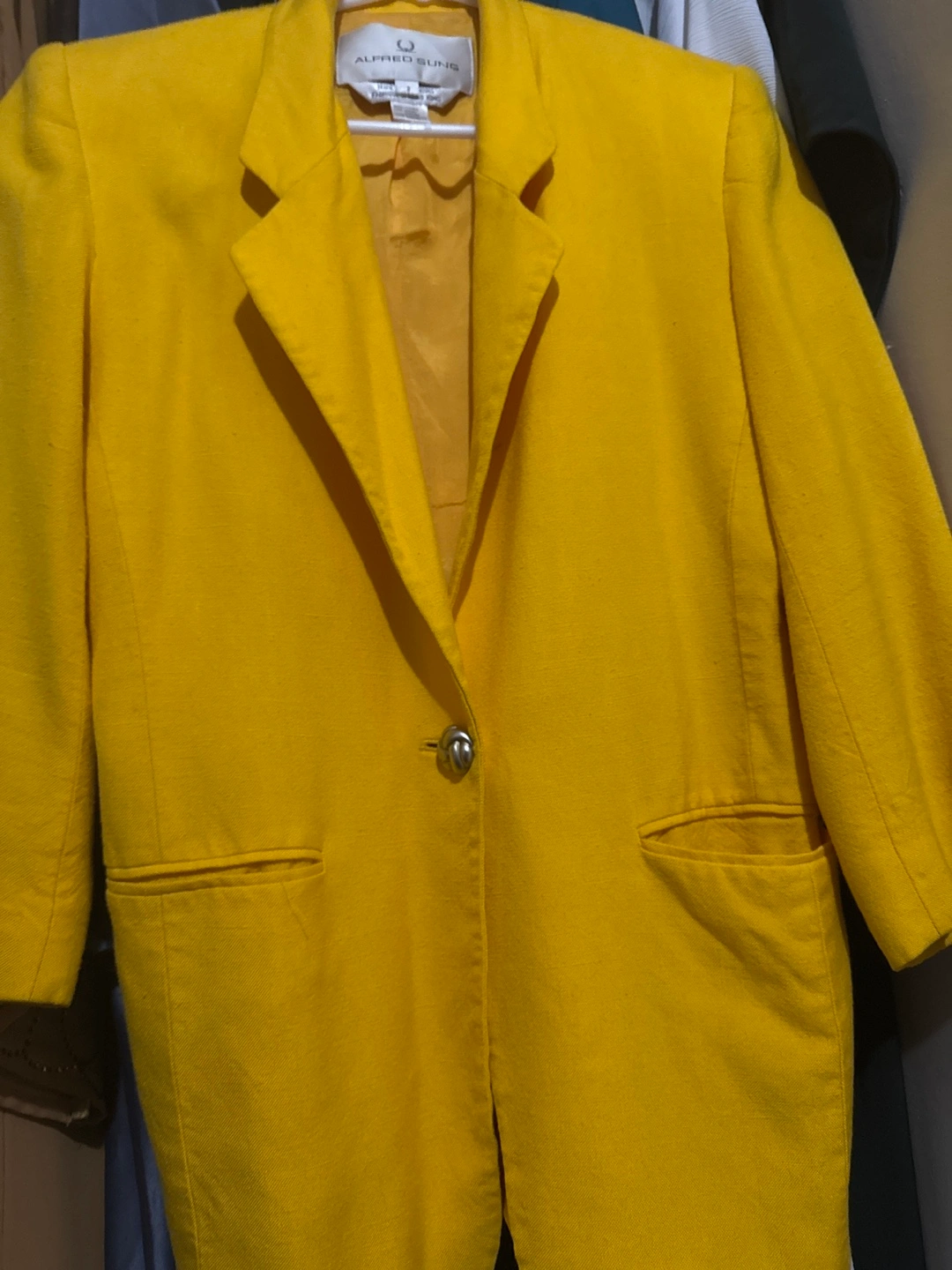 Women's vintage Alfred Sung blazer. Mustard yellow colour. Single button closure. Long sleeves. Pockets.