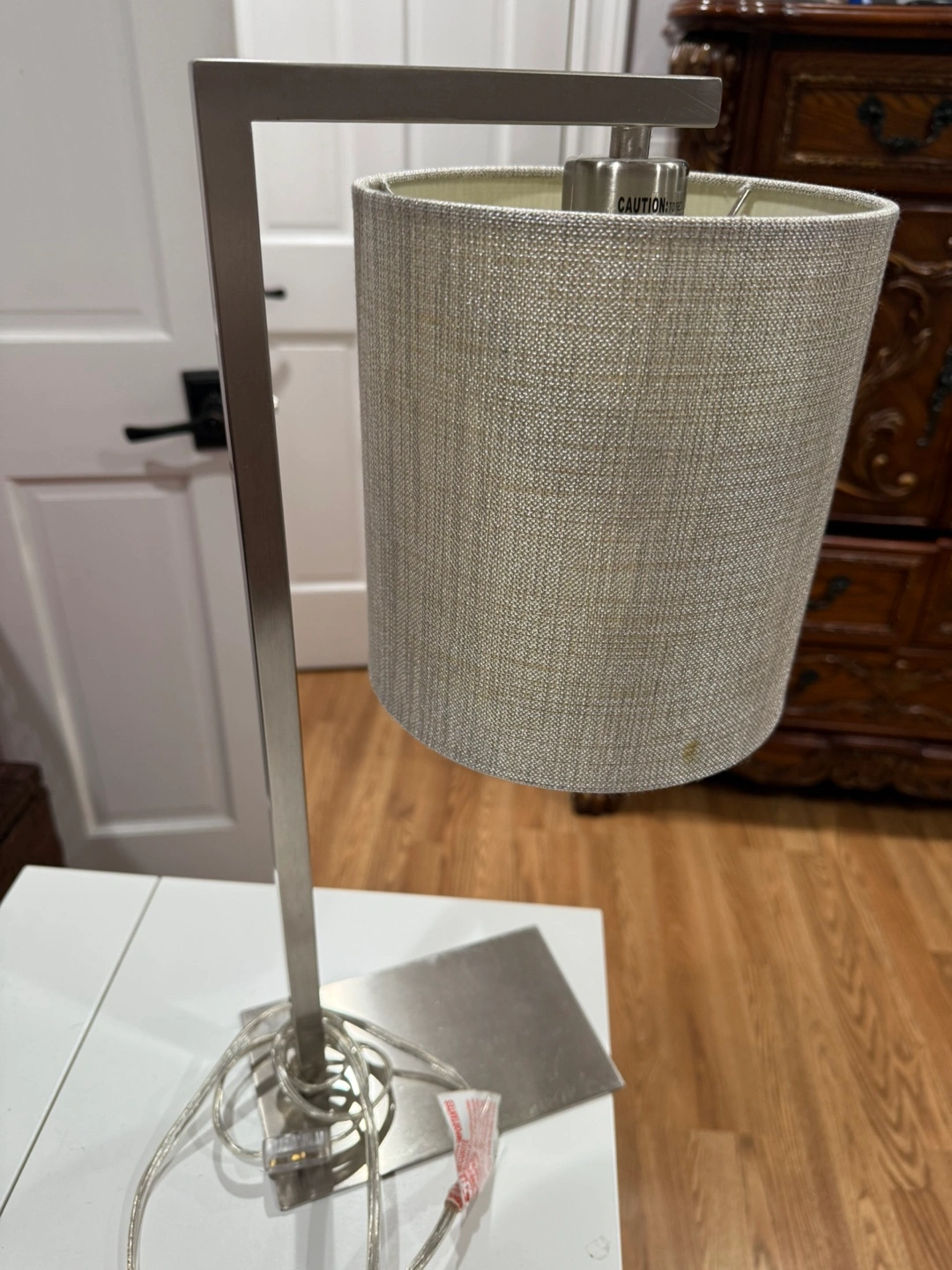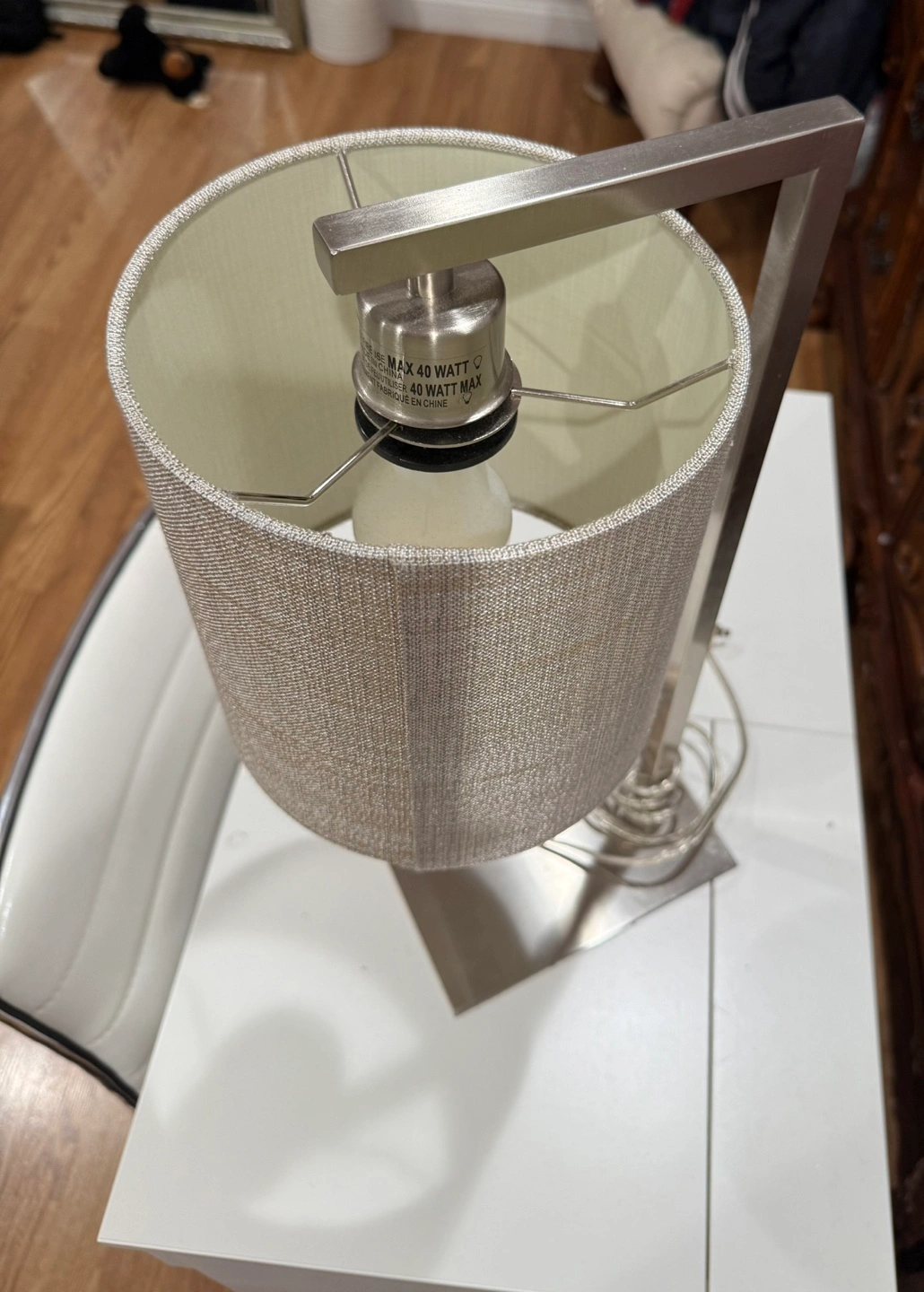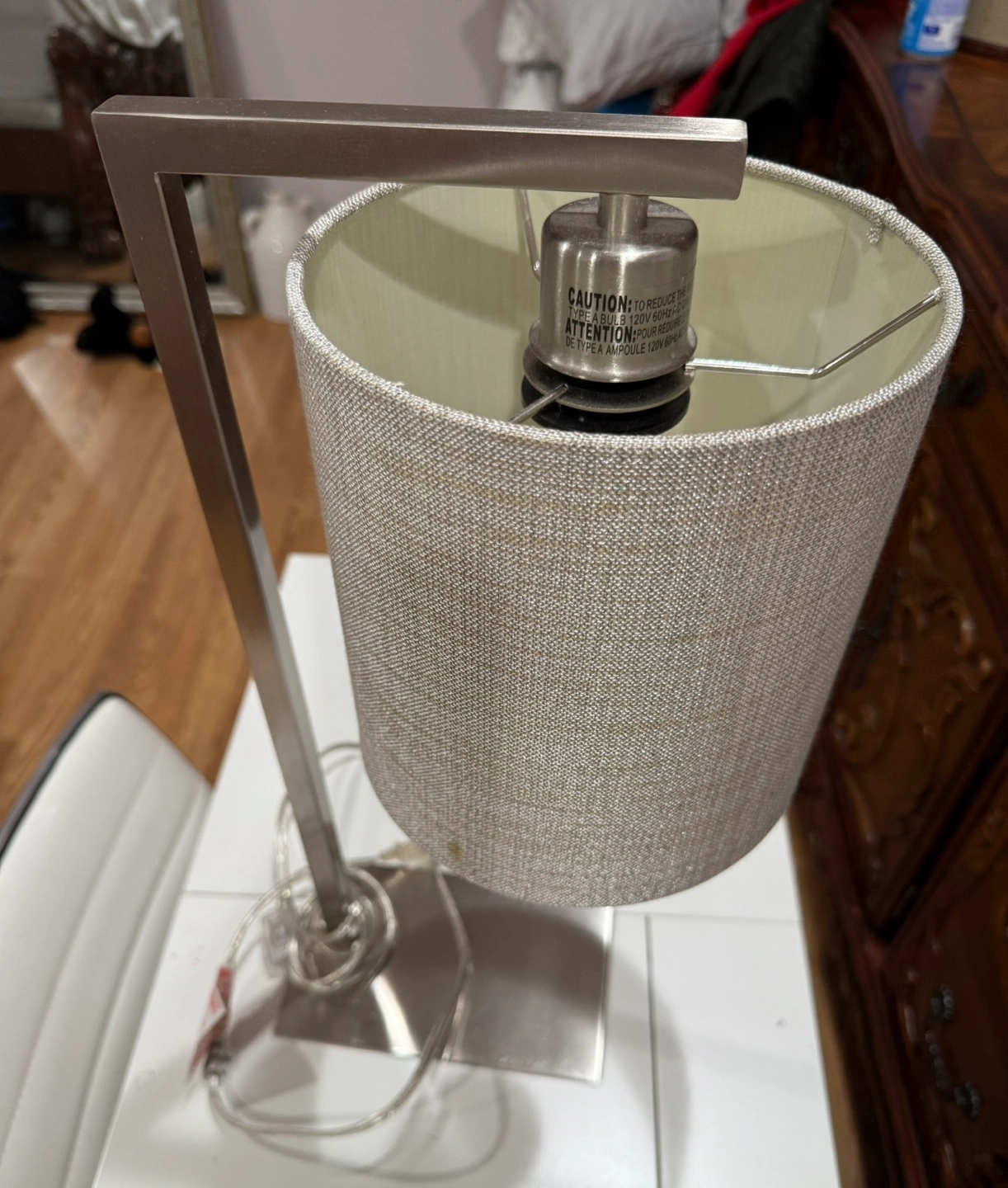 Stylish brushed nickel table lamps. Features a beige linen drum shade. Simple and elegant design. Perfect for bedside or end table. Set of 2