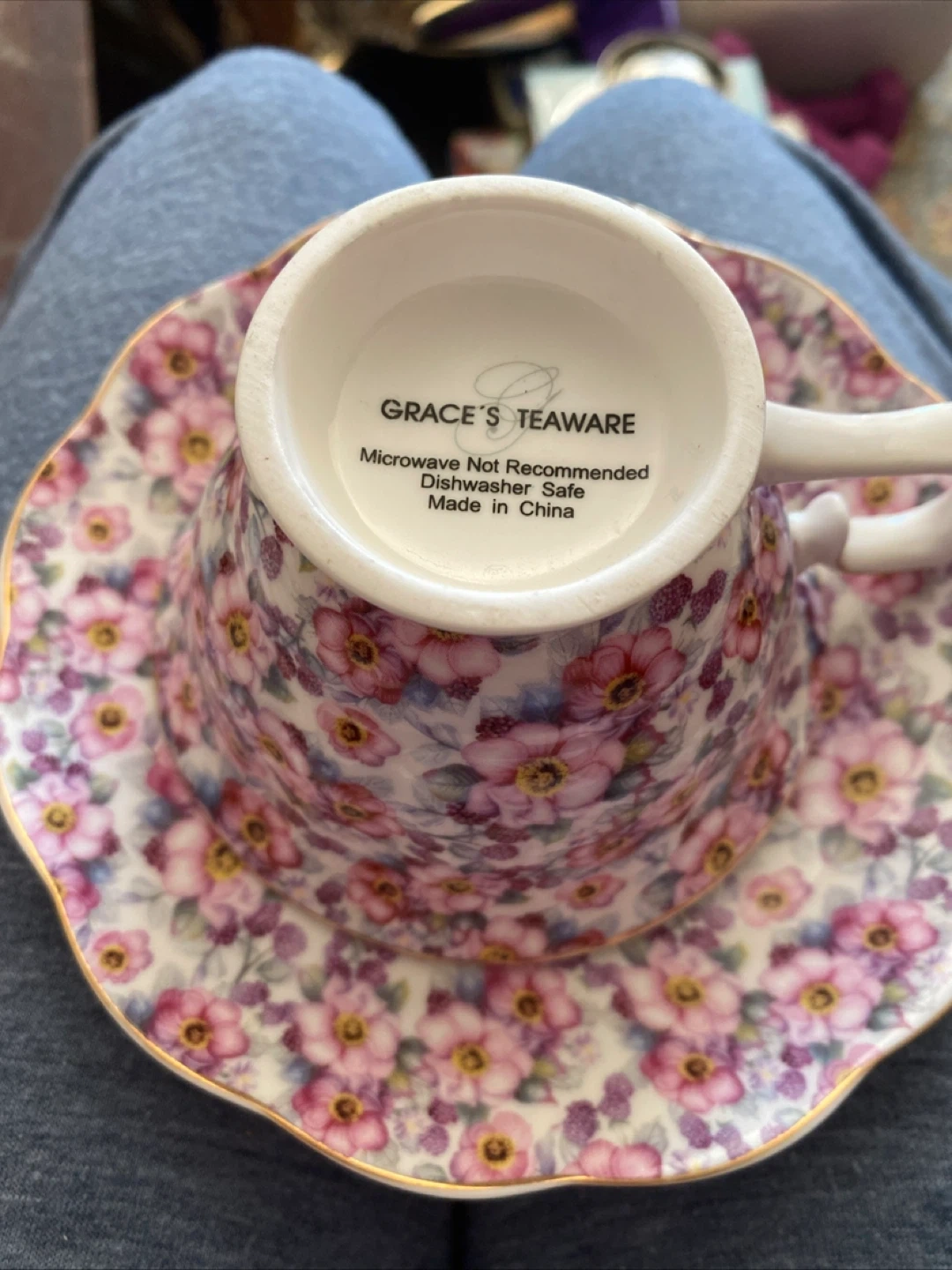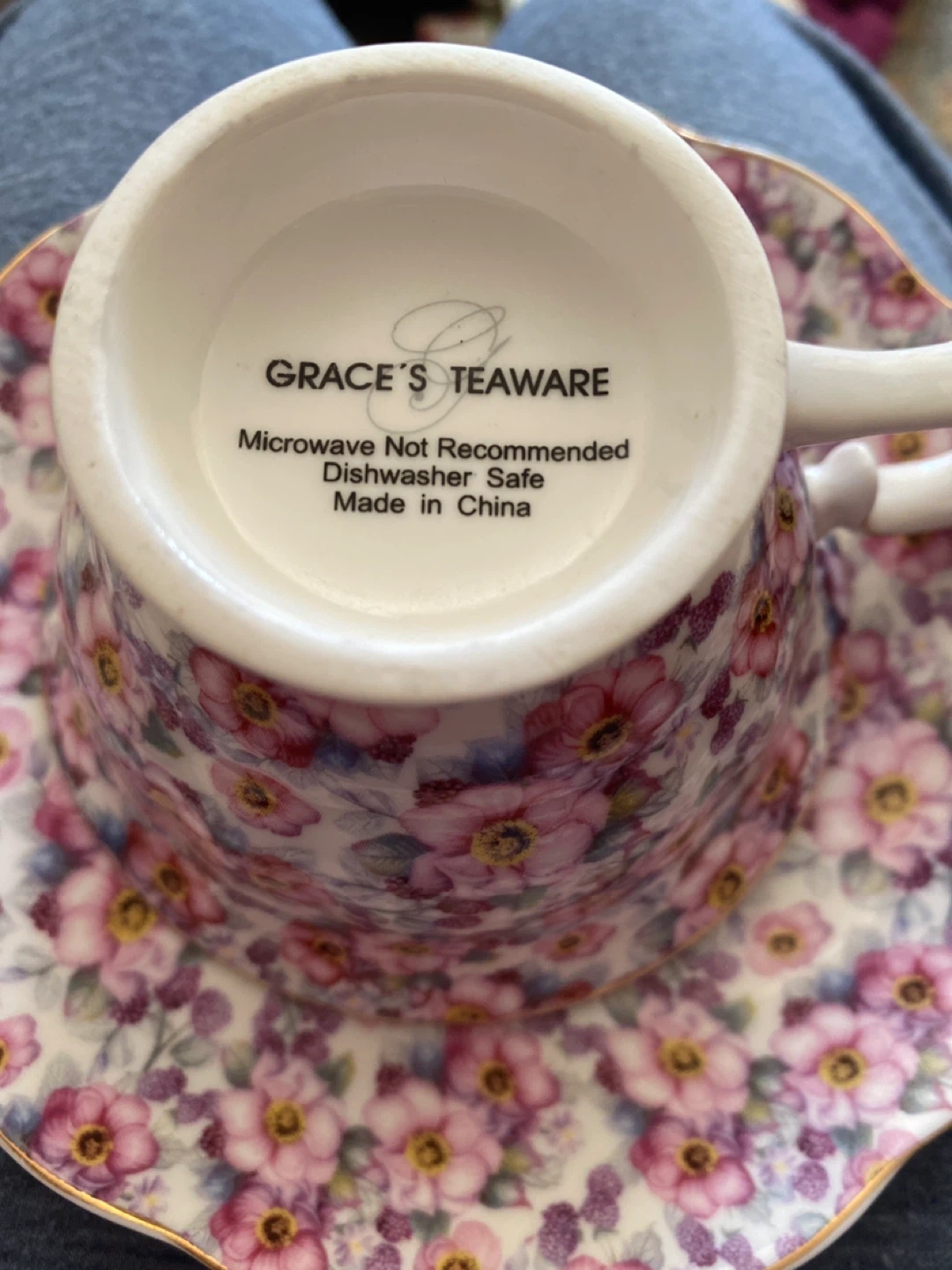 Beautiful floral teacup and saucer set from Grace's Teaware. Dishwasher safe. Microwave not recommended. Adds a lovely touch to your tea time!