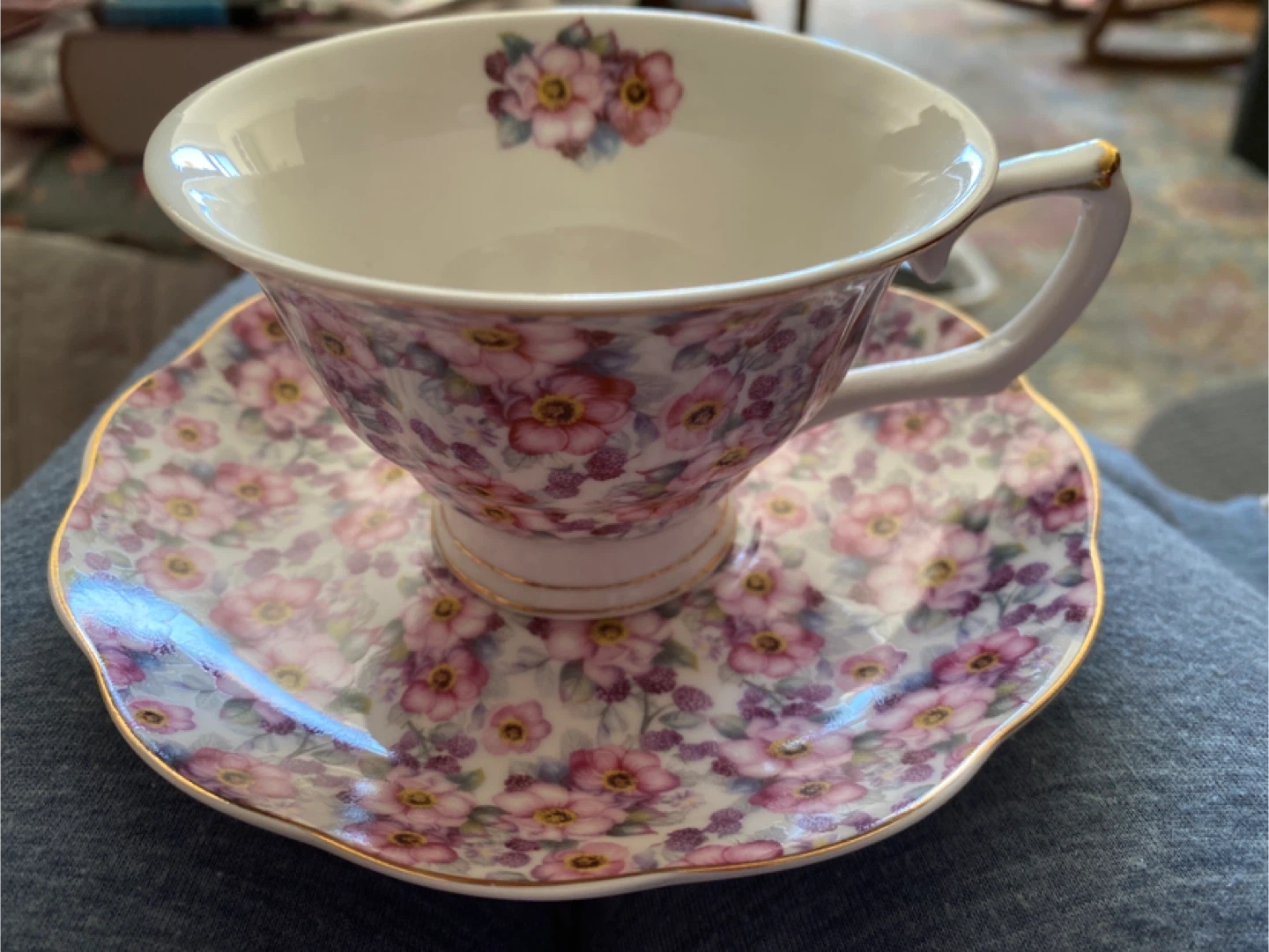 Beautiful floral teacup and saucer set from Grace's Teaware. Dishwasher safe. Microwave not recommended. Adds a lovely touch to your tea time!