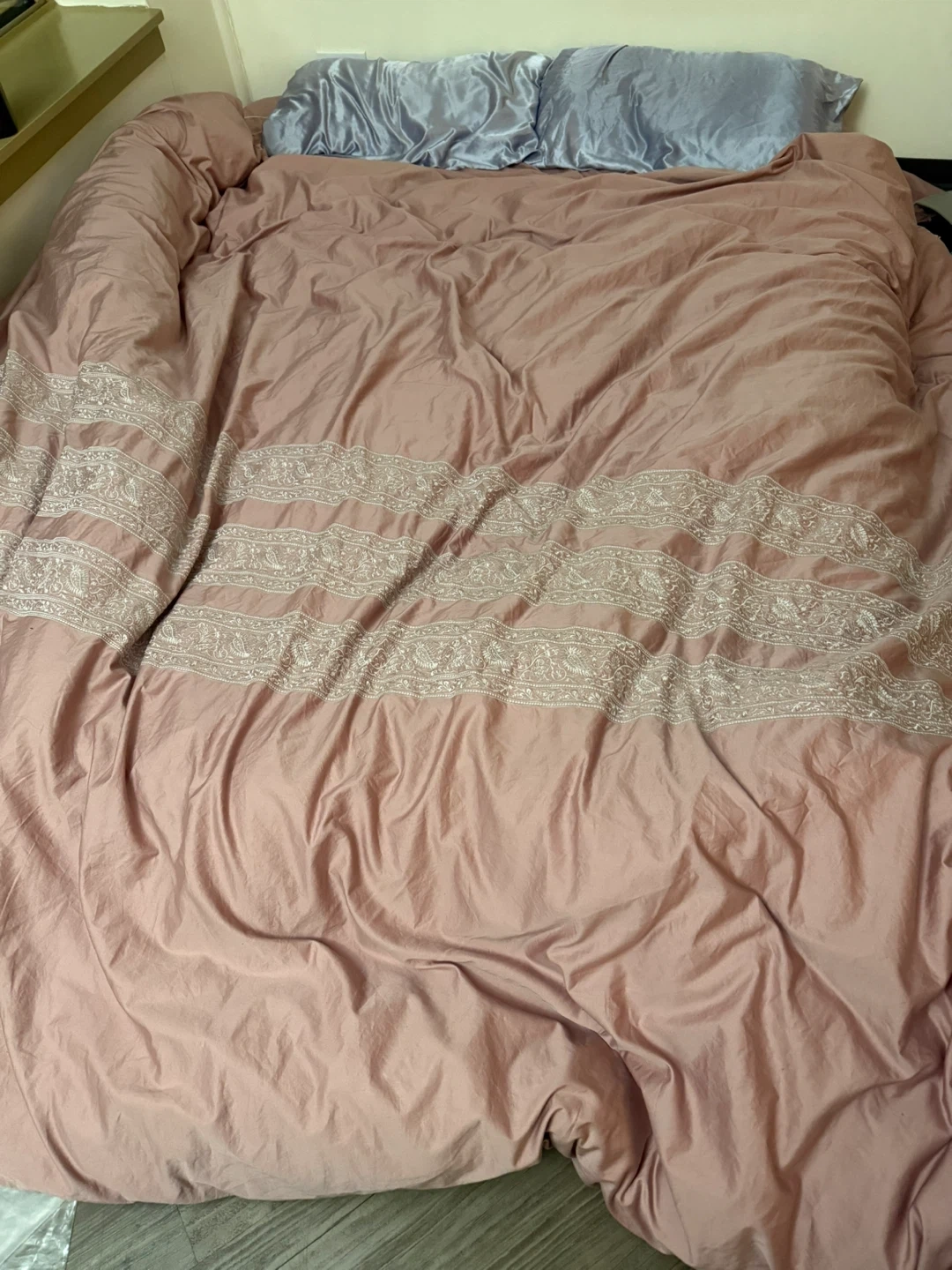A lovely pink comforter with a decorative embroidered border. It's soft and provides a cozy feel. Perfect for adding a touch of elegance to your bedroom!