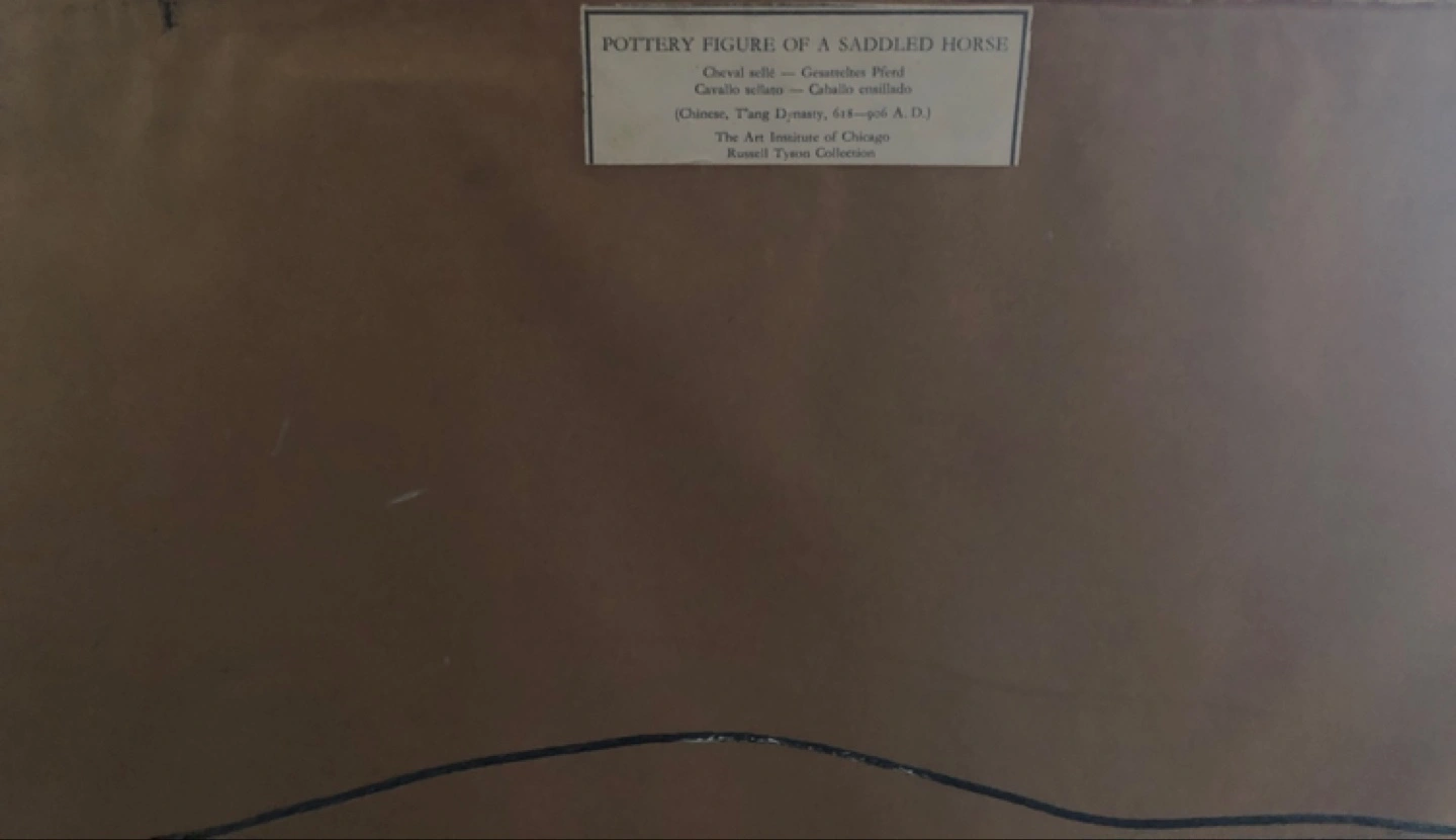 Framed print depicting a pottery figure of a saddled horse. Gold frame. Matted. Back of frame includes information about the original artwork. Image from The Art Institute of Chicago.