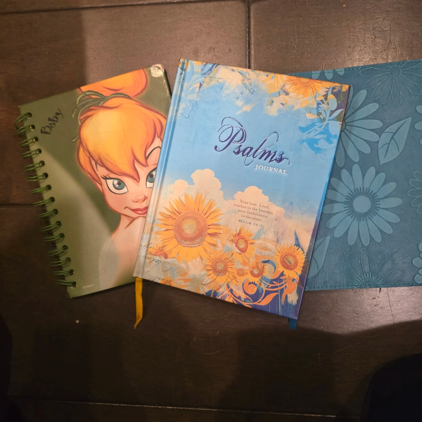 Psalms Journal with a scripture quote from Psalm 36:5 and a colorful sunflower design. Also includes a Baby journal with Tinkerbell from Disney. Both are bound with spiral or stitched covers.