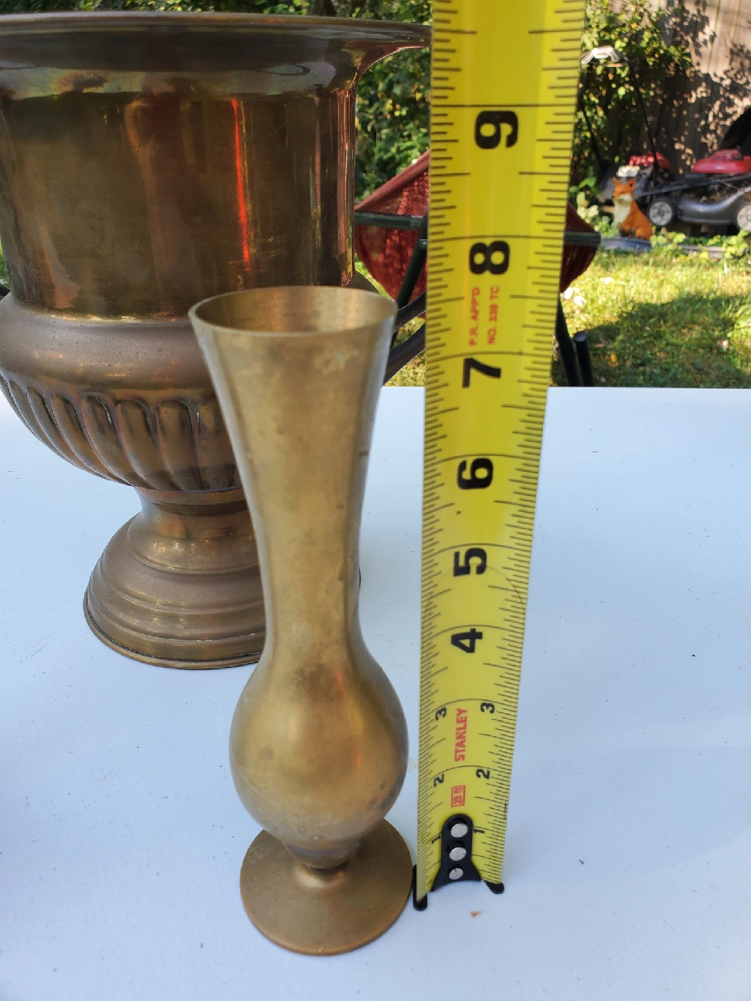 Selling a vintage brass urn and vase set. The urn measures approximately 8 inches in diameter. The vases are about 7 inches tall. The vases have a 'Made in Taiwan' sticker on the bottom