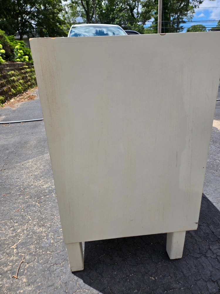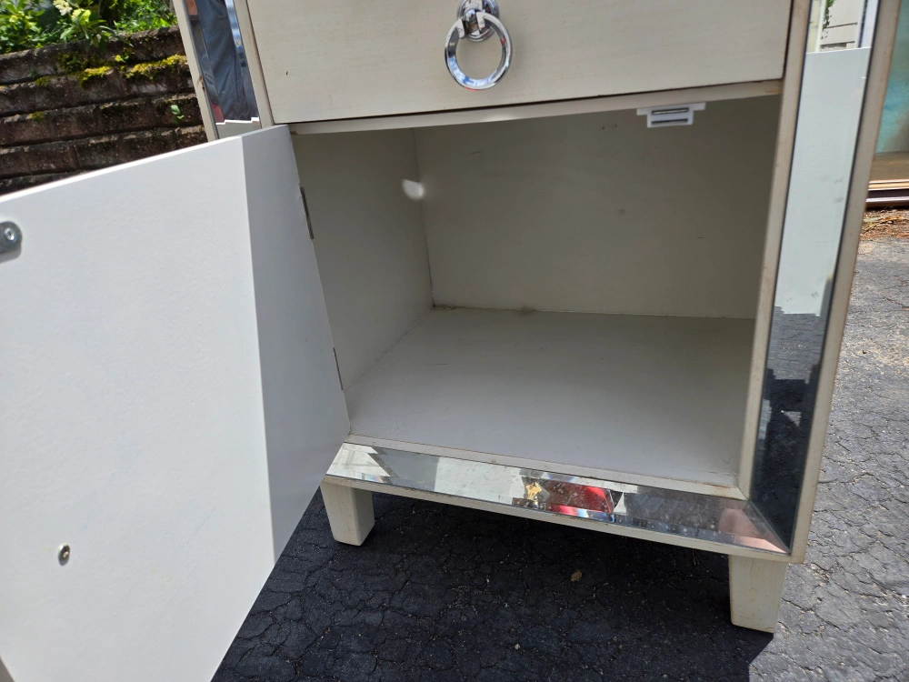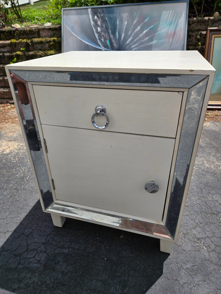 Selling a mirrored accent table nightstand. It features a drawer and a cabinet for storage. There is some damage on the side of the drawer.