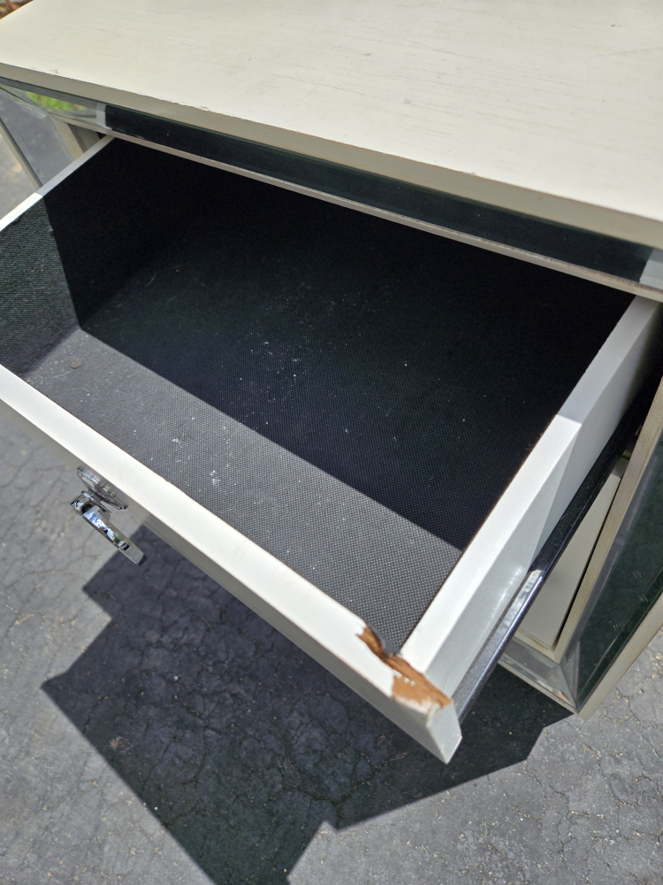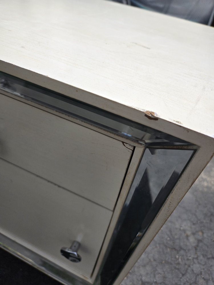 Selling a mirrored accent table nightstand. It features a drawer and a cabinet for storage. There is some damage on the side of the drawer.