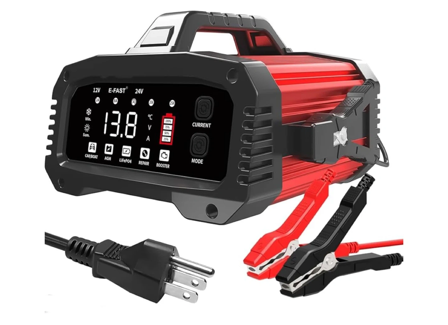 E-FAST 12V/24V car battery charger for Car/Boat, AGM, LiFePO4, Repair, and Booster modes. Features a digital display showing voltage, amperage, and battery charge level. Includes a power cord and jumper clamps for immediate use!
