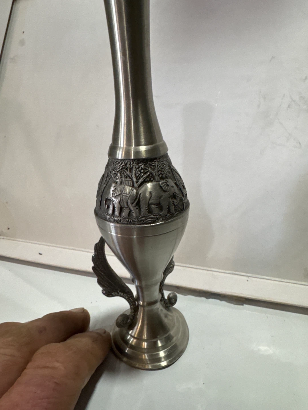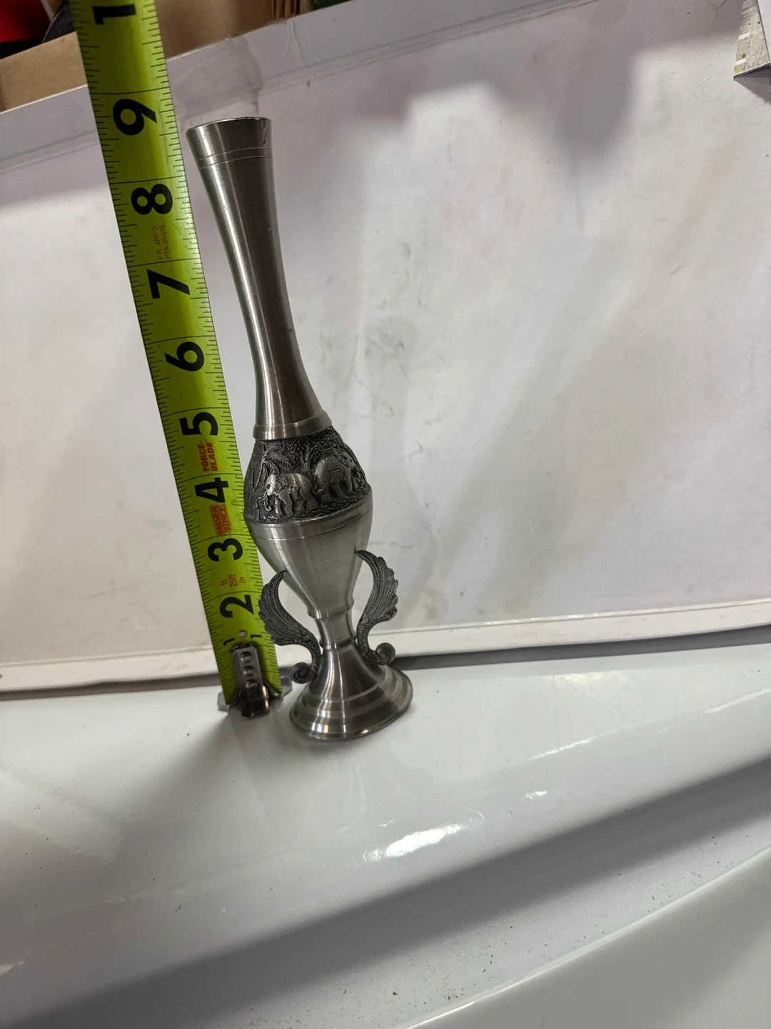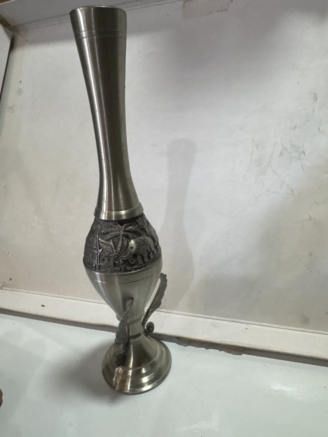 Here's a unique vase featuring an intricate elephant design. I believe it to be stainless steel cause it is not magnetic and it DOES NOT say 925/.925 ANYWHERE ON THAT I CAN SEE so I am going with stainless steel. If you love the elephants, this is a beautiful piece that could add a touch of elegance to any room. It appears to be in great condition and ready to be displayed
