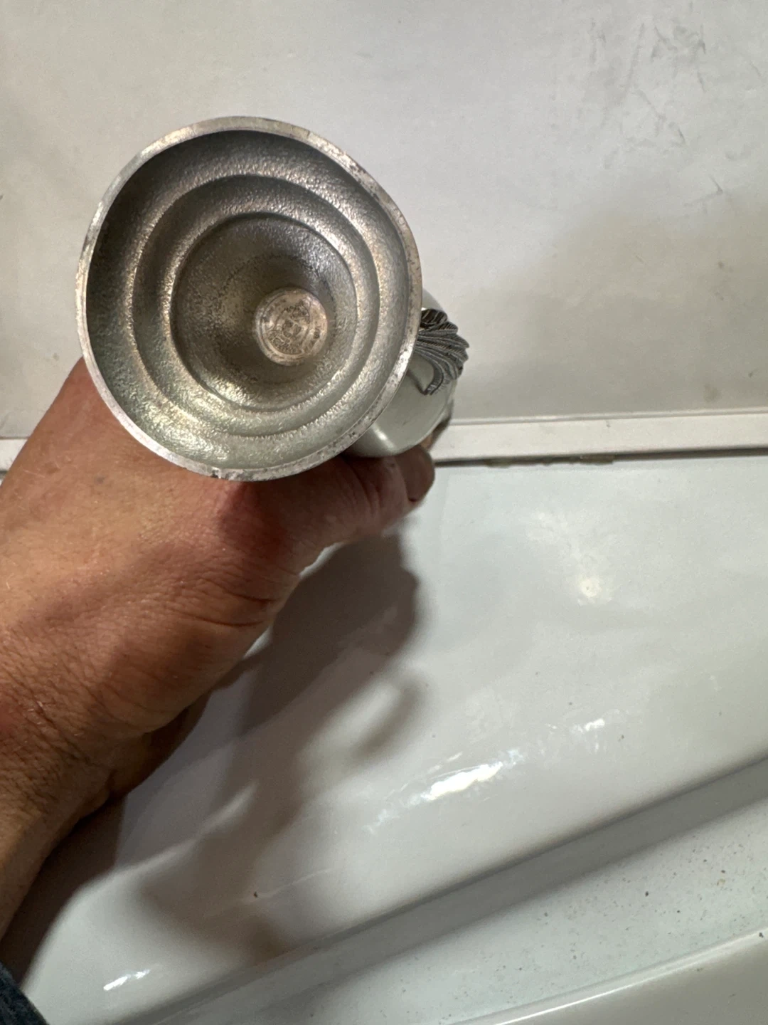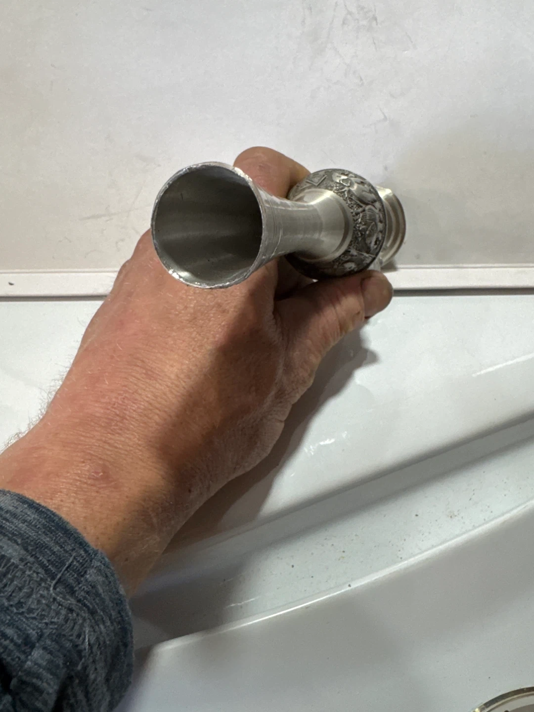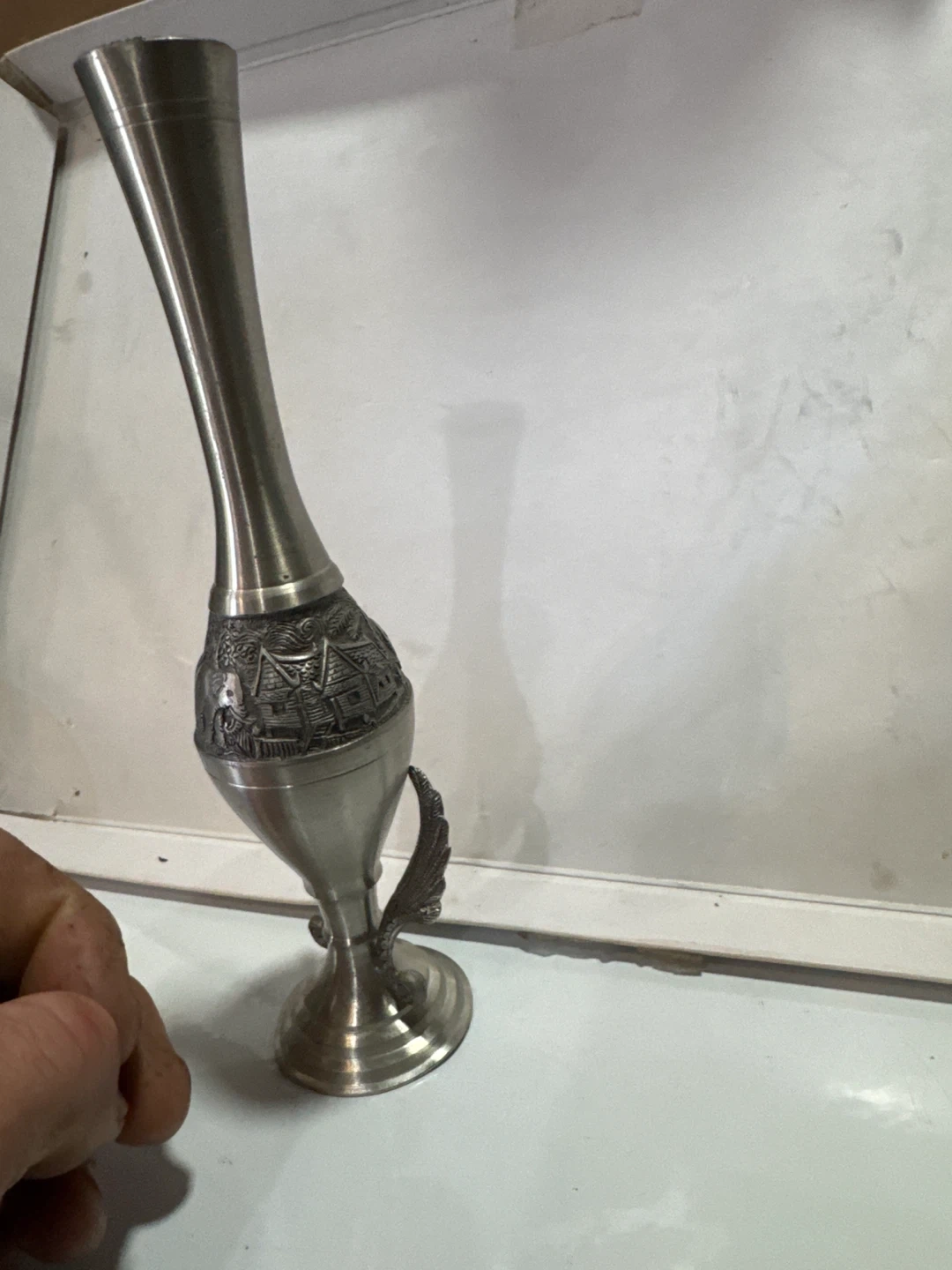 Here's a unique vase featuring an intricate elephant design. I believe it to be stainless steel cause it is not magnetic and it DOES NOT say 925/.925 ANYWHERE ON THAT I CAN SEE so I am going with stainless steel. If you love the elephants, this is a beautiful piece that could add a touch of elegance to any room. It appears to be in great condition and ready to be displayed