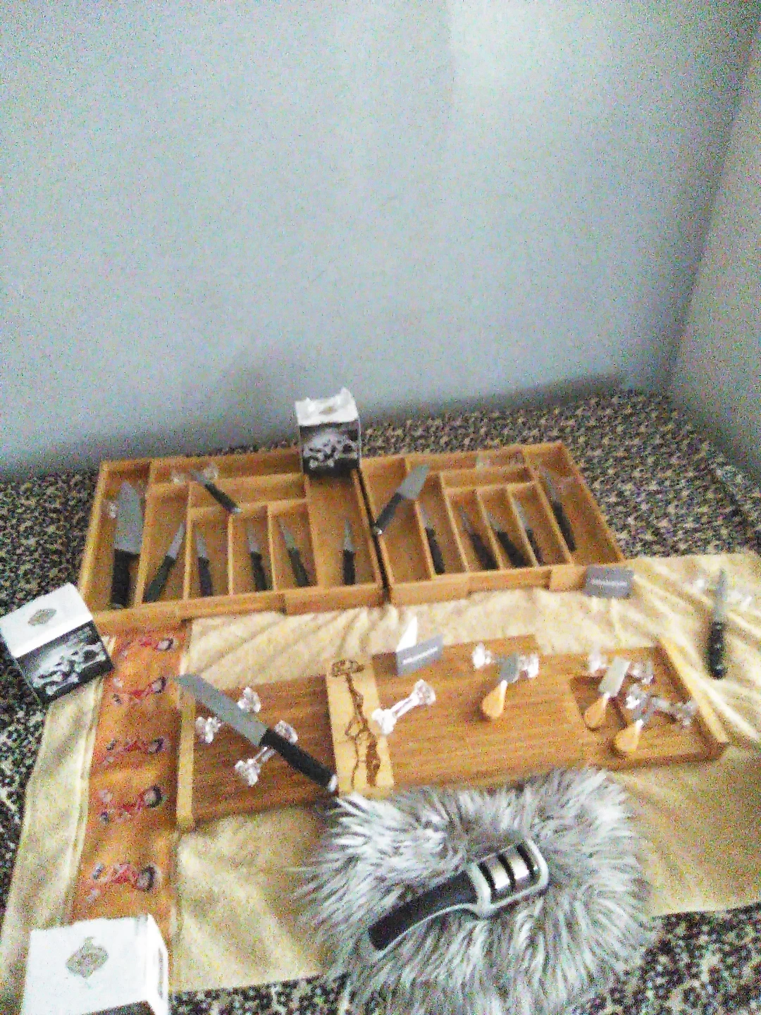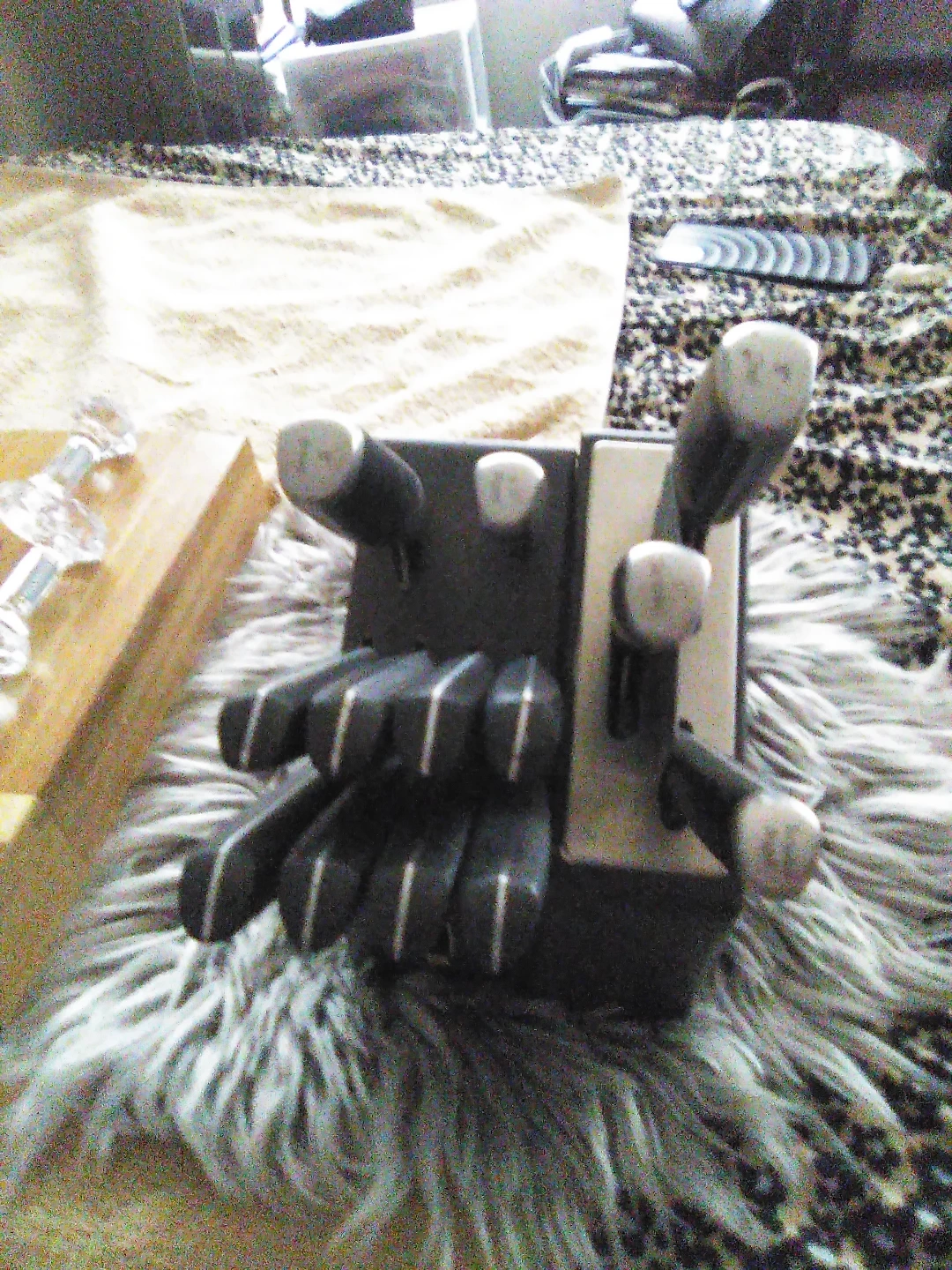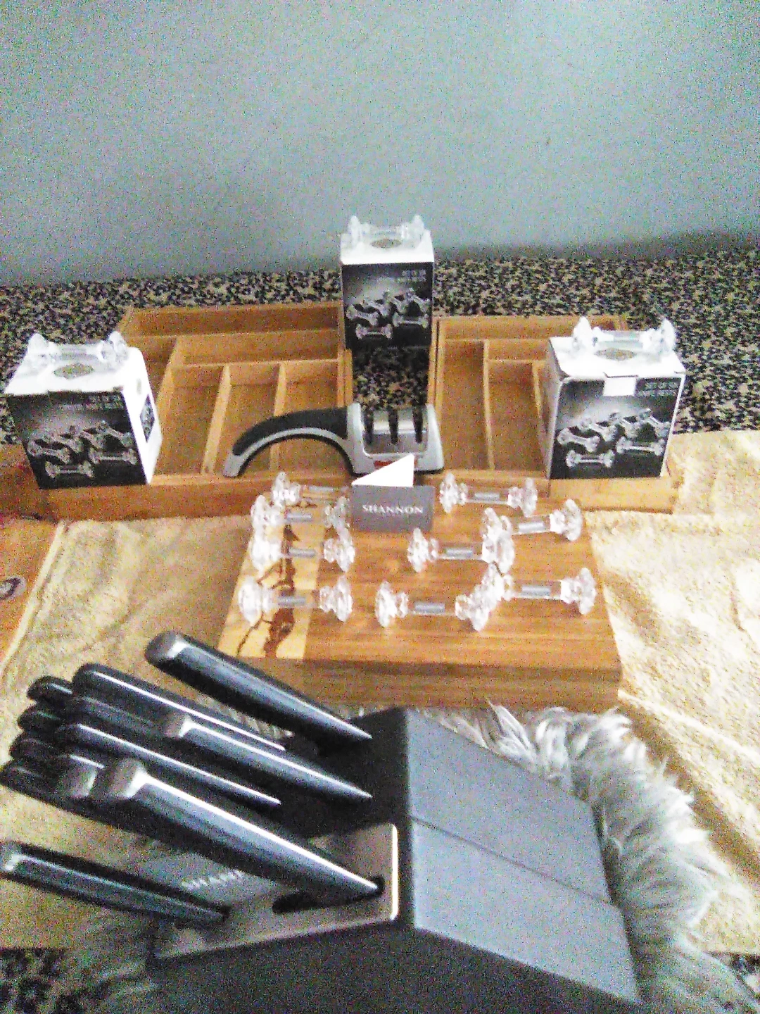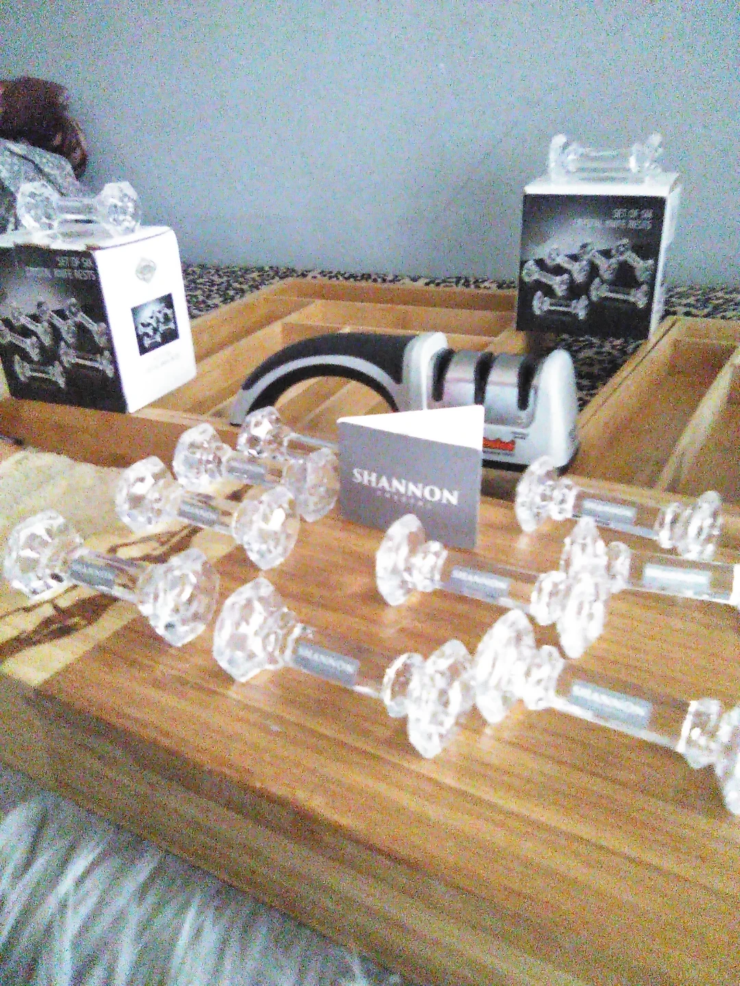 The Authentic Shannon Crystals knife holders each set included 6 piece, $15 each, also included a novelty designed wooden cutting board set is a high-quality kitchen accessory perfect for both home and BBQ areas. It adds a touch of elegance to your kitchen or outdoor cooking space. Also included: a M & L bamboo wooden dresser organizers & the Chefs Choice kitten Knife sharpener. With its sturdy construction and unique design, both the cutting board & wooden utensil/knife holders are both functional and stylish, making it a must-have for any cooking enthusiast including the 13 piece knife set(which is not included). IF U WANT ANYTHING SOLD SEPARATELY. $122 total price sold separately $85 altogether