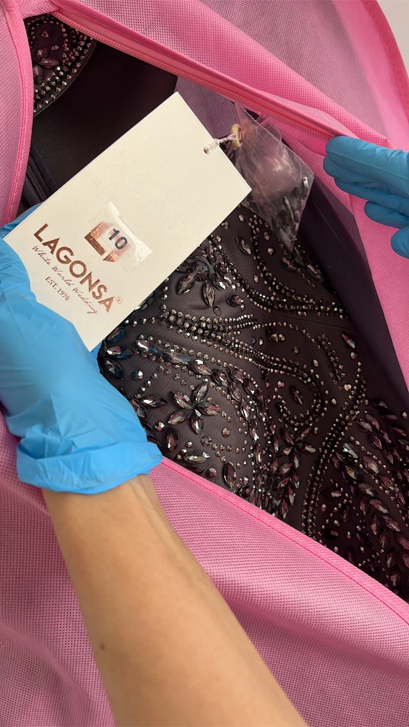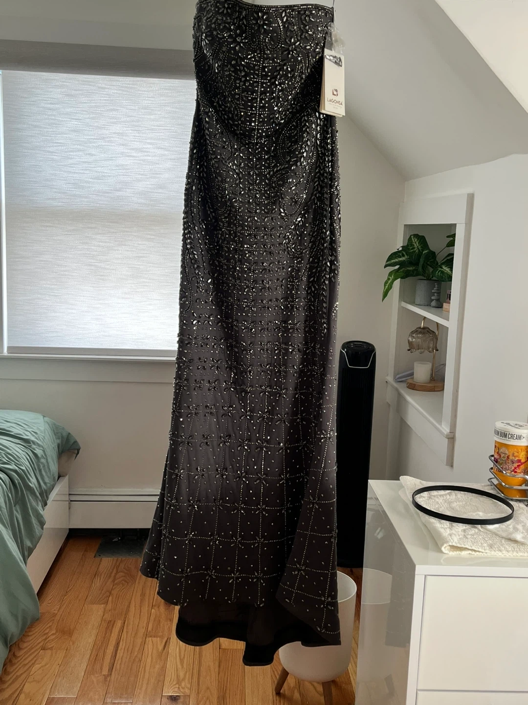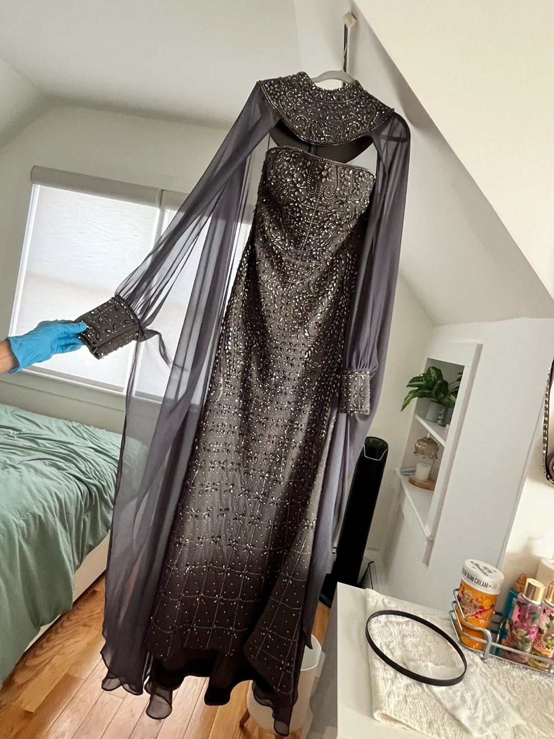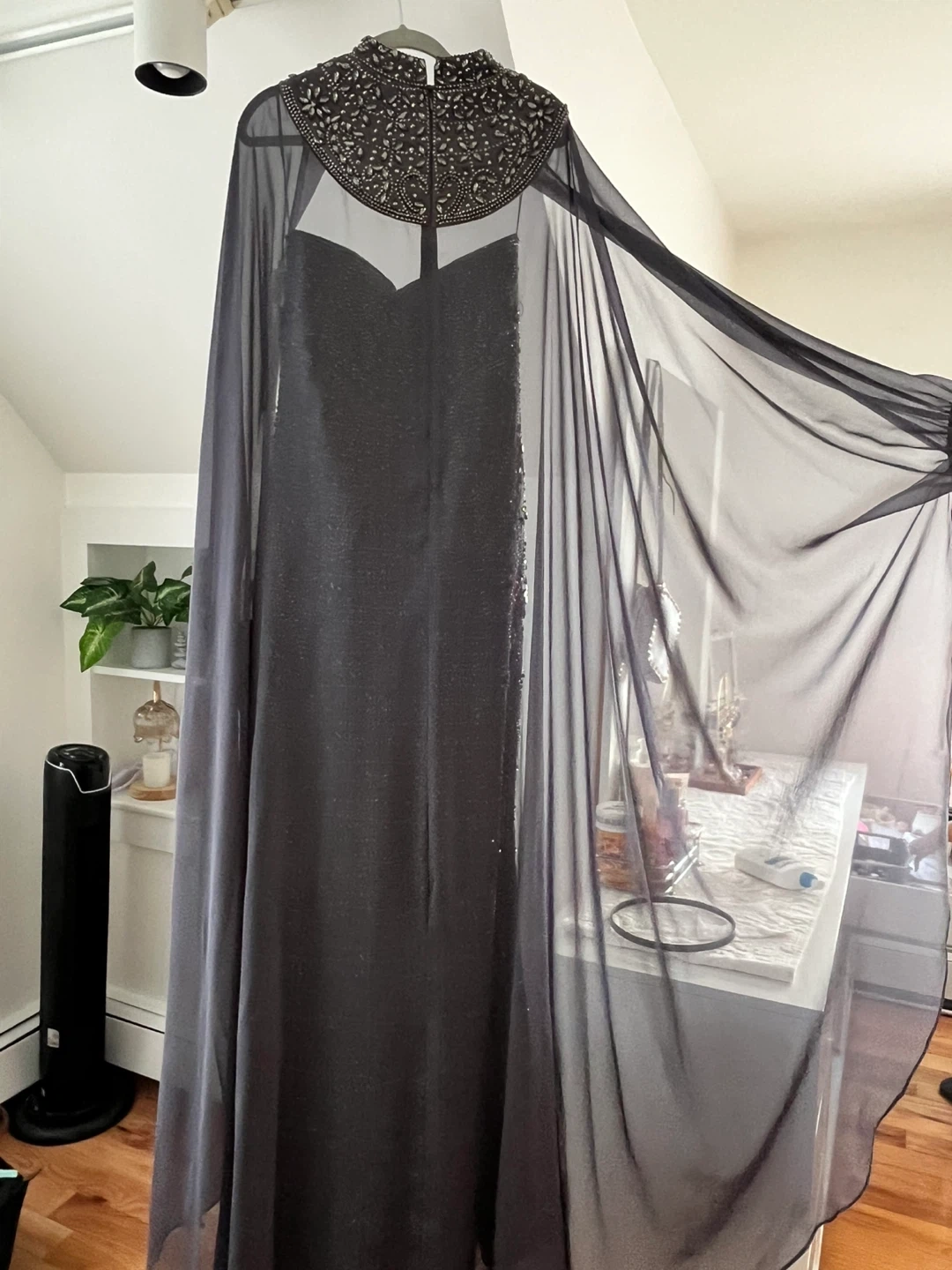 Selling a Lagonza dress in size 10. The dress is a beautiful gray color and comes with a cape. Perfect for a special occasion!