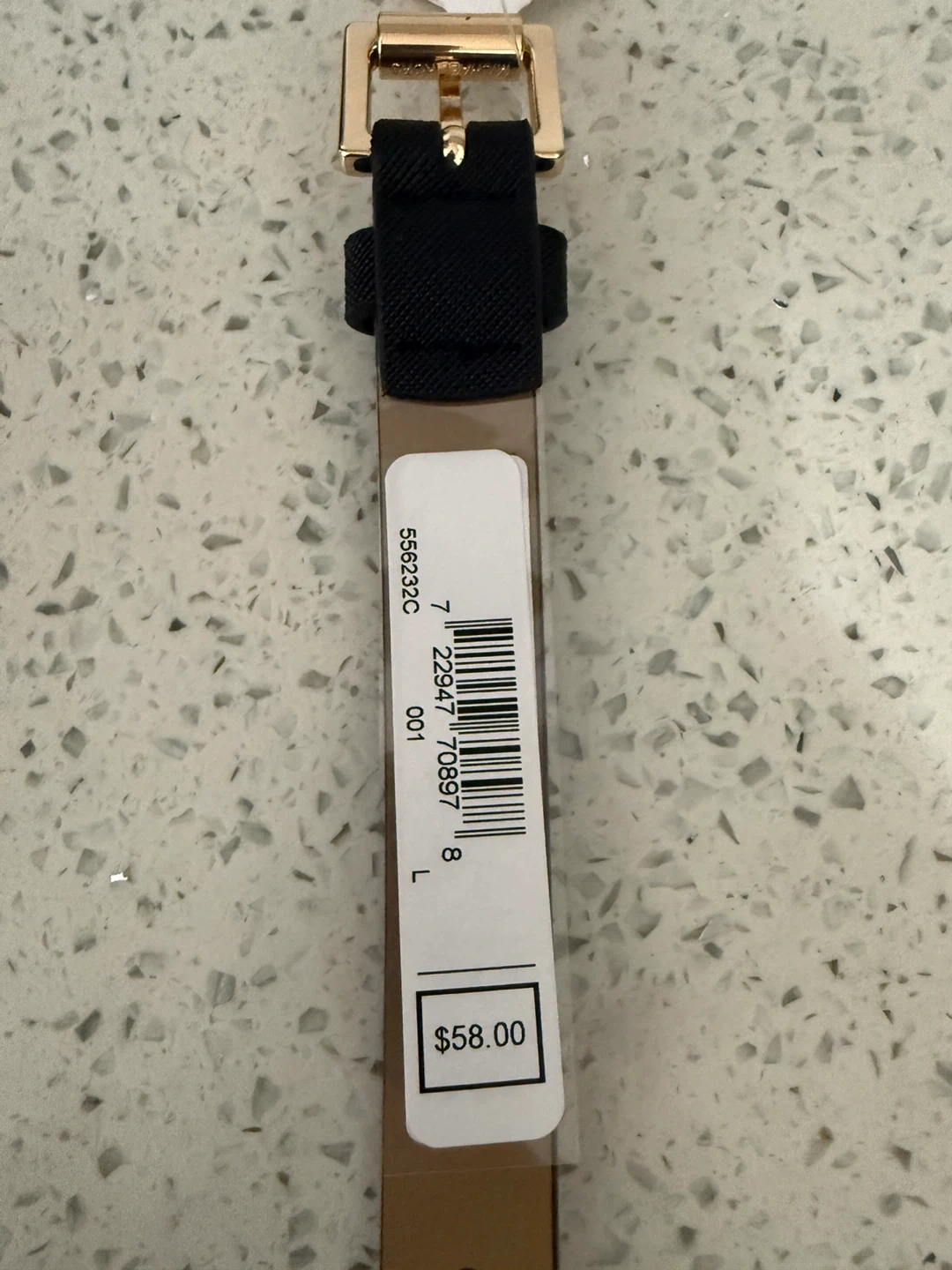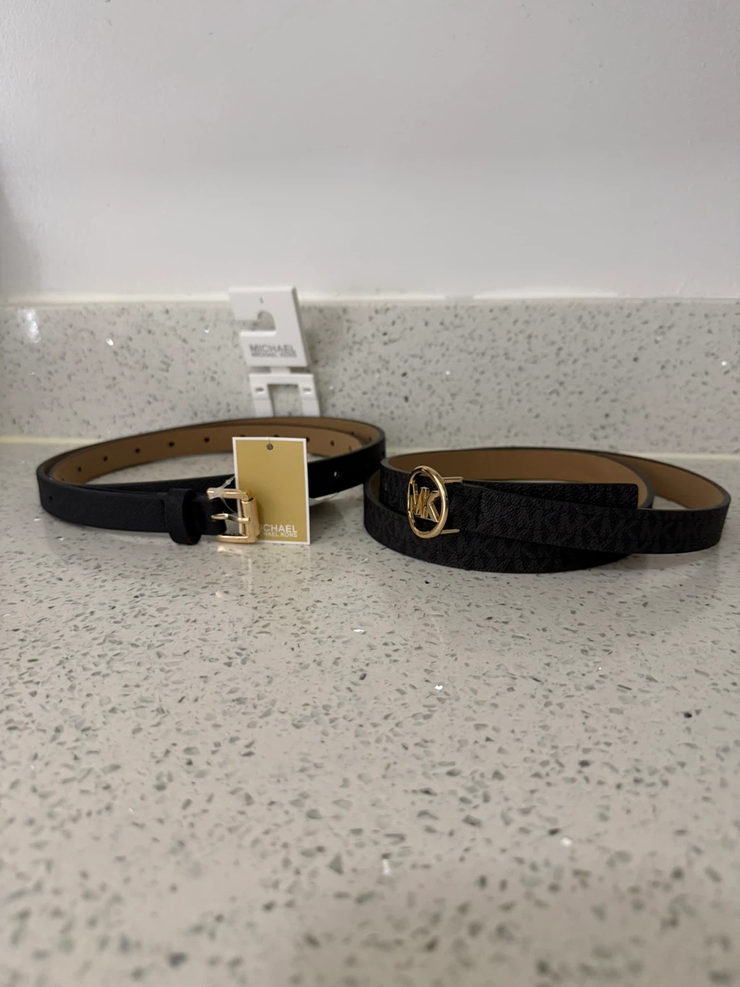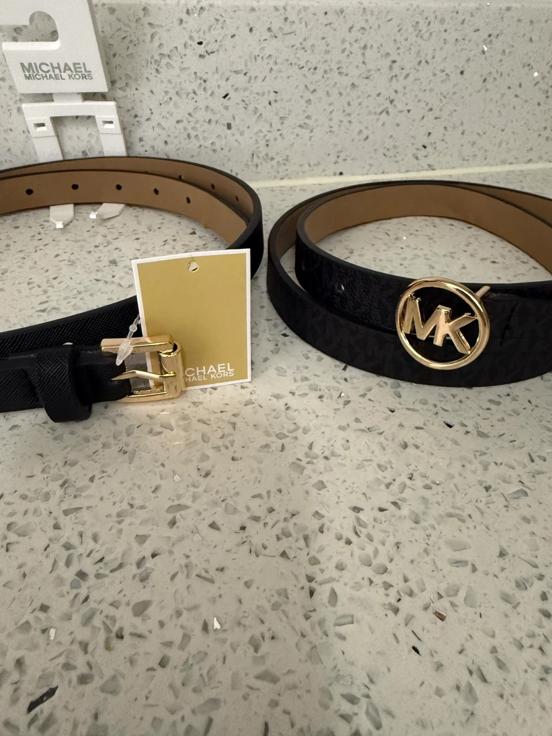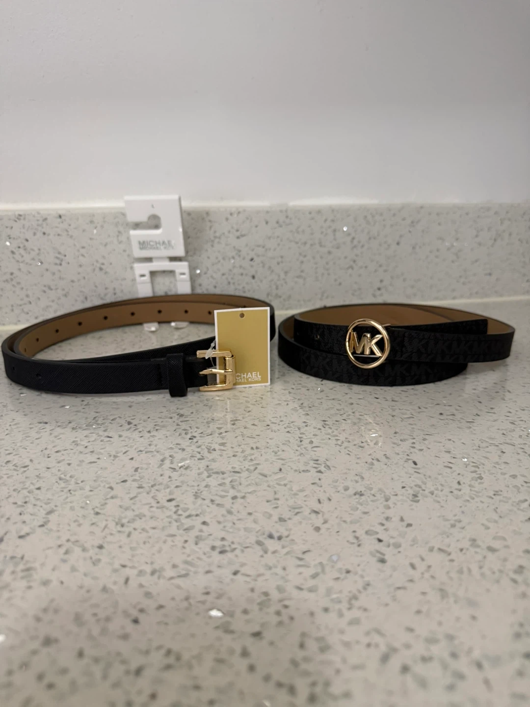 Includes two black Michael Kors belts. One features a gold MK logo buckle and a patterned finish. The other has a gold buckle and a smooth finish. Both belts are size L and come with original tags.