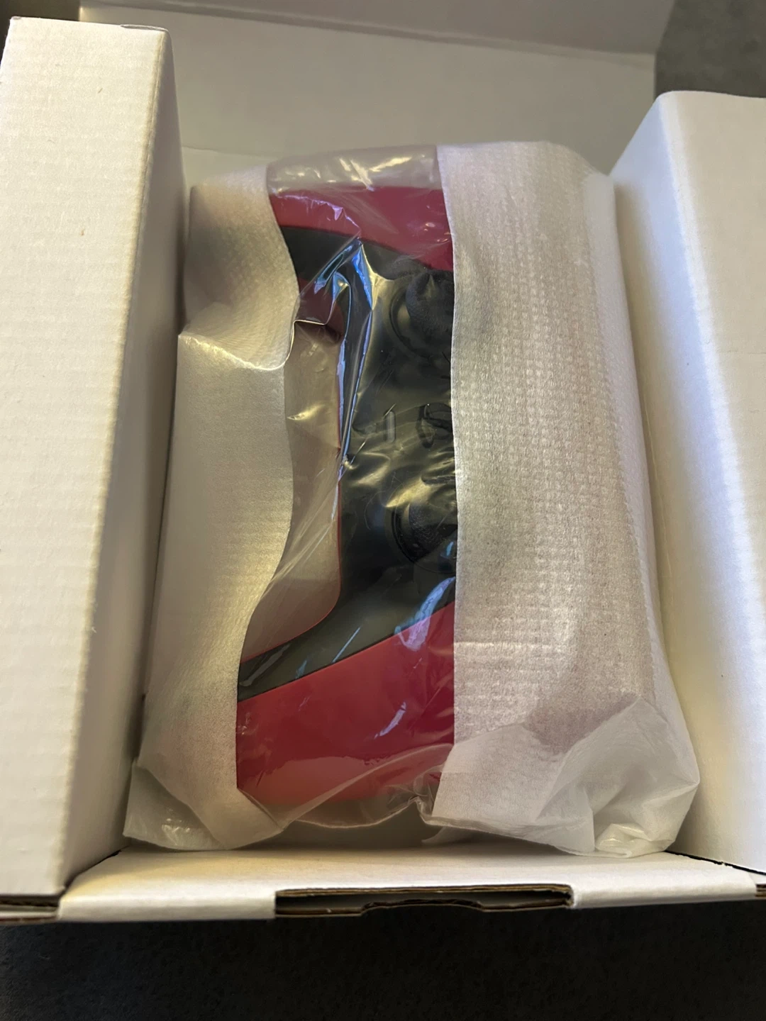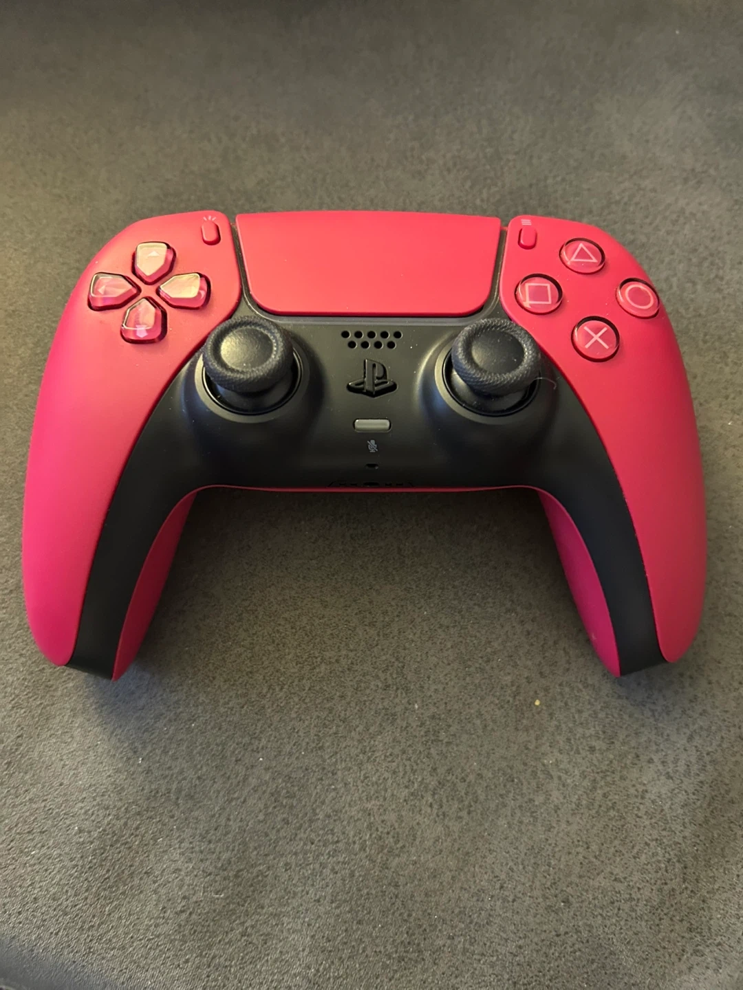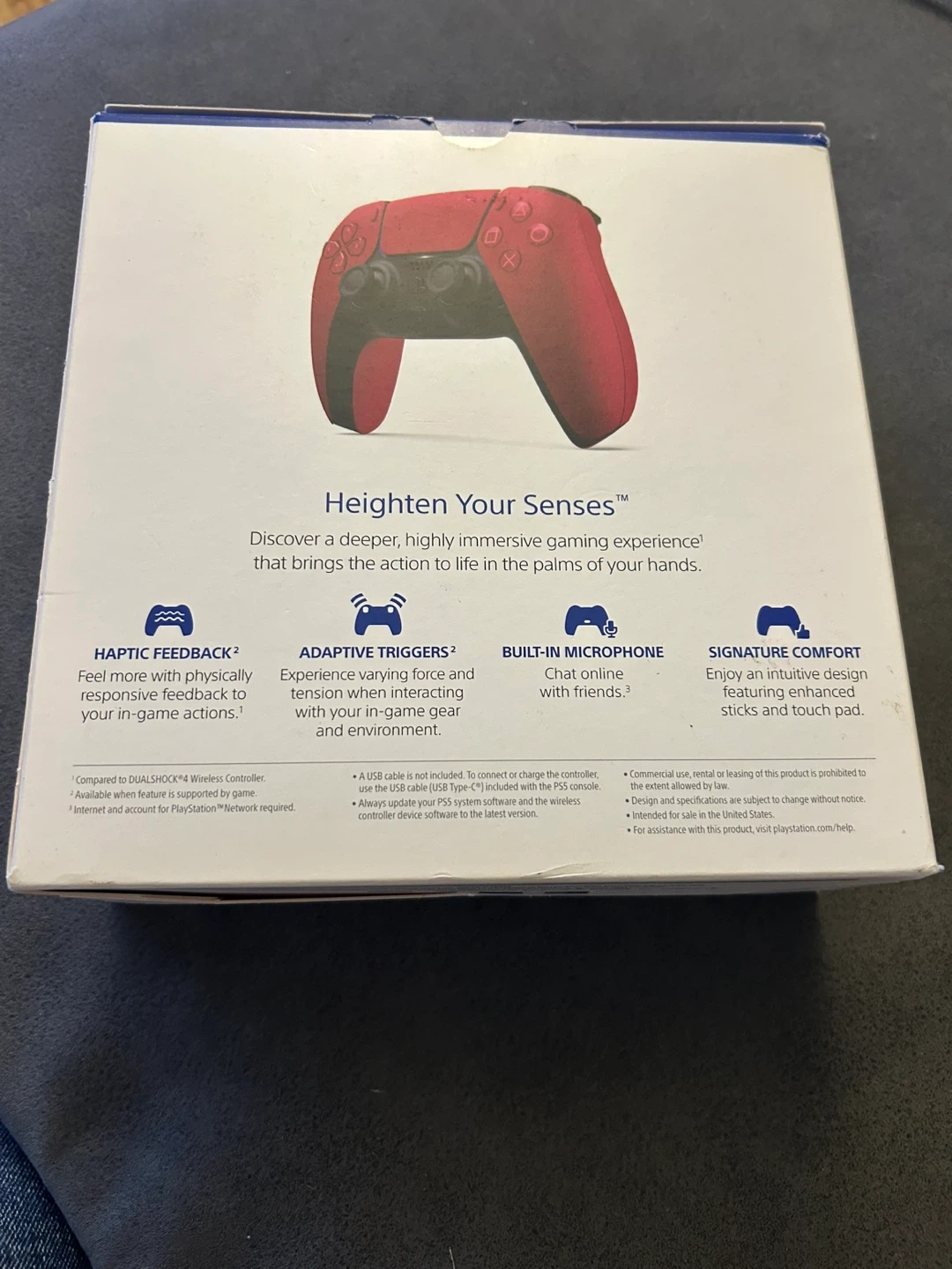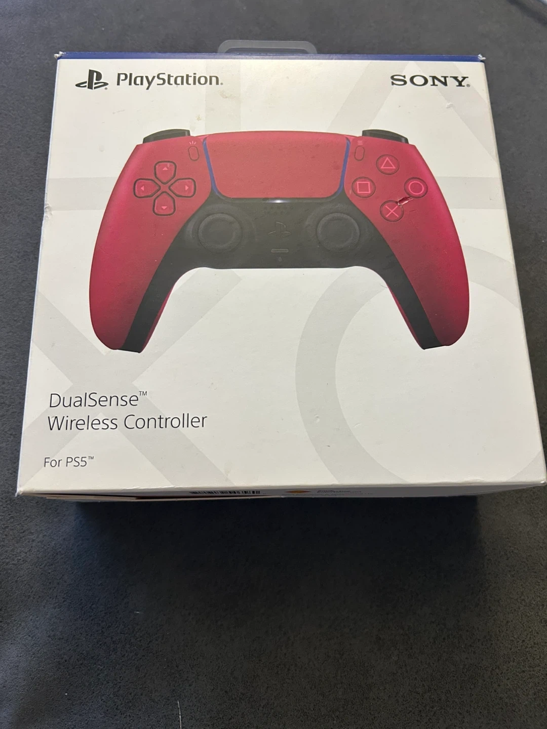 This is a Sony PlayStation 5 DualSense wireless controller. It's designed for an immersive gaming experience with haptic feedback and adaptive triggers. The controller is a vibrant red color and includes its original box.