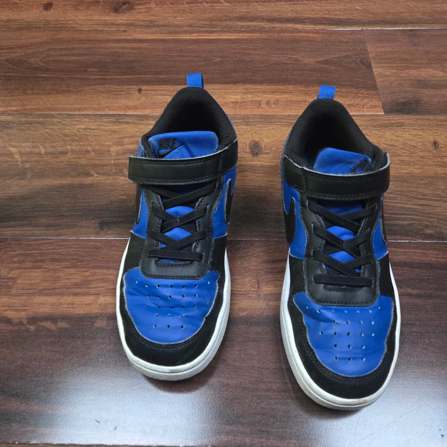 These are Nike kids' shoes in a blue and black colorway. They feature a hook and loop strap closure with laces. Size is 2Y (US), 1.5 (UK), 33.5 (EUR).