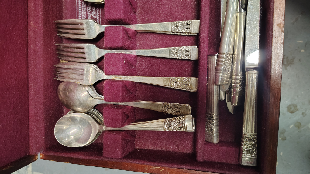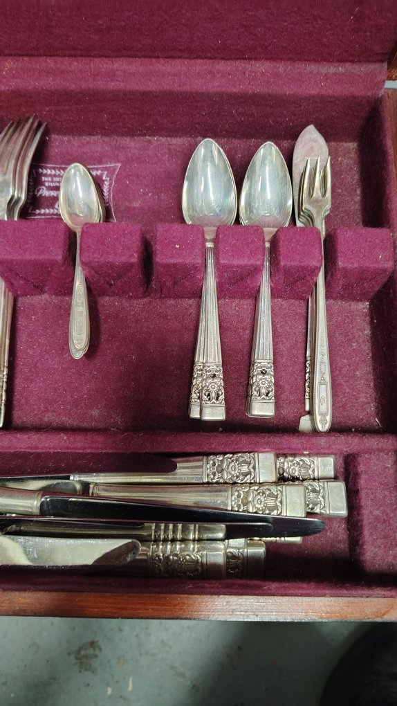 Selling a beautiful vintage silverware set that comes in a wooden box. The silverware is in good condition and has an elegant design. The wooden box has a red velvet interior to keep the silverware organized and protected. Perfect for adding a touch of classic charm to your dining experience! silver plated aka community silver made by Gorham