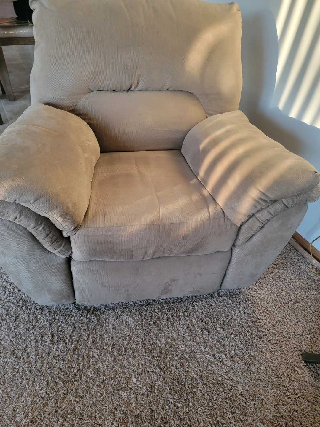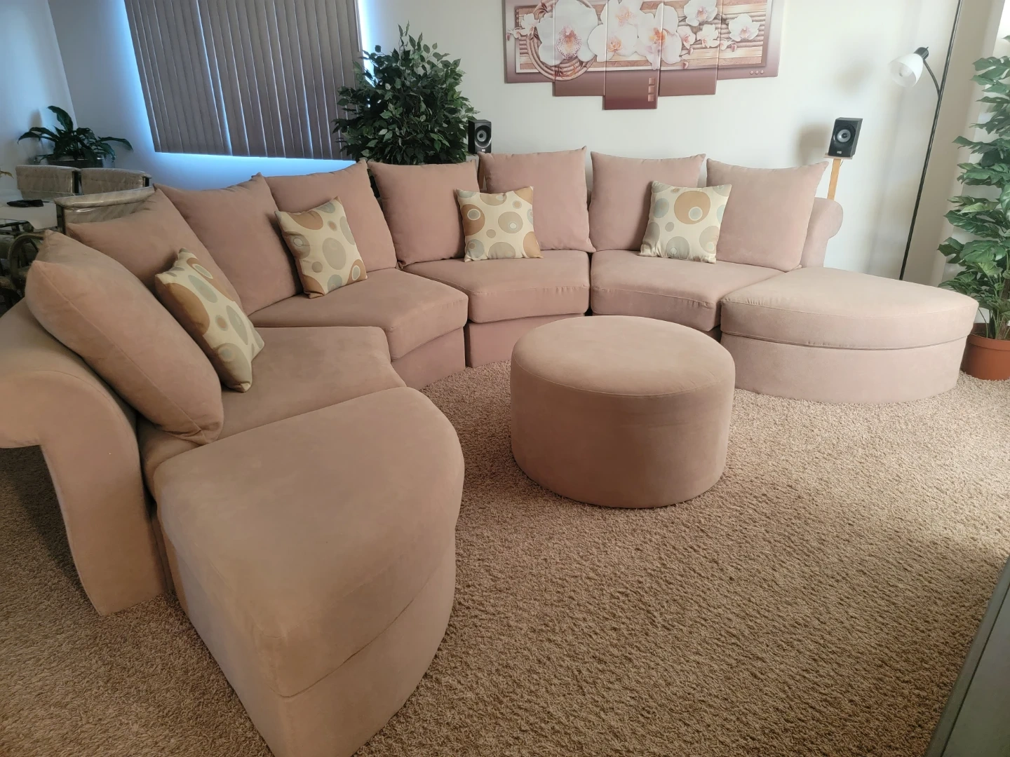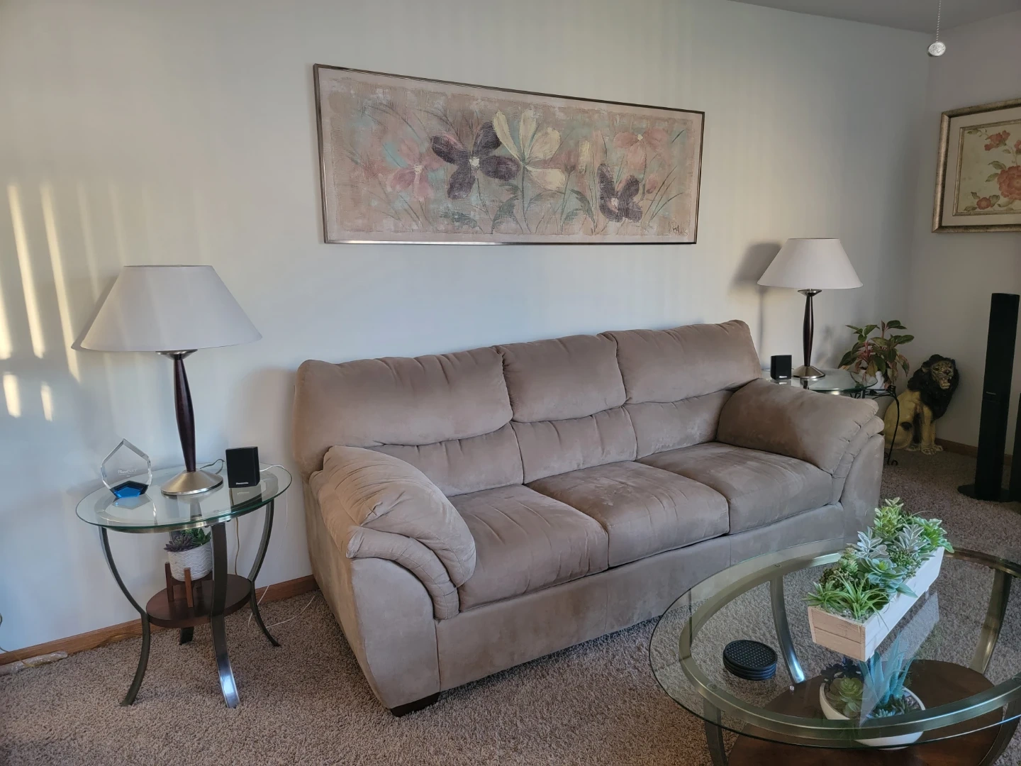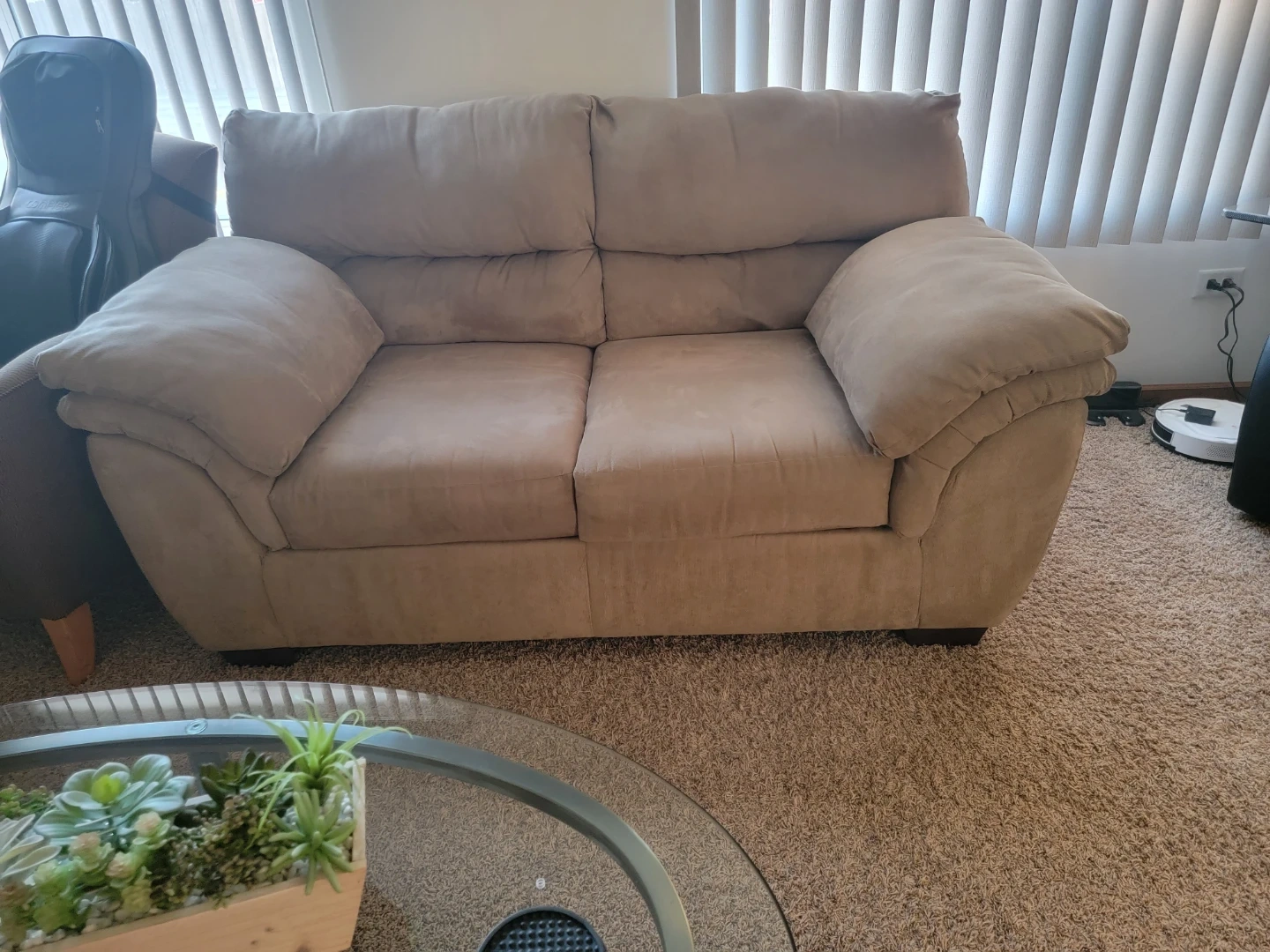 Comfortable loveseat sofa with a soft, light brown microfiber upholstery. It offers plush seating for two people. This sofa has generously padded cushions and rolled arms for a cozy feel.