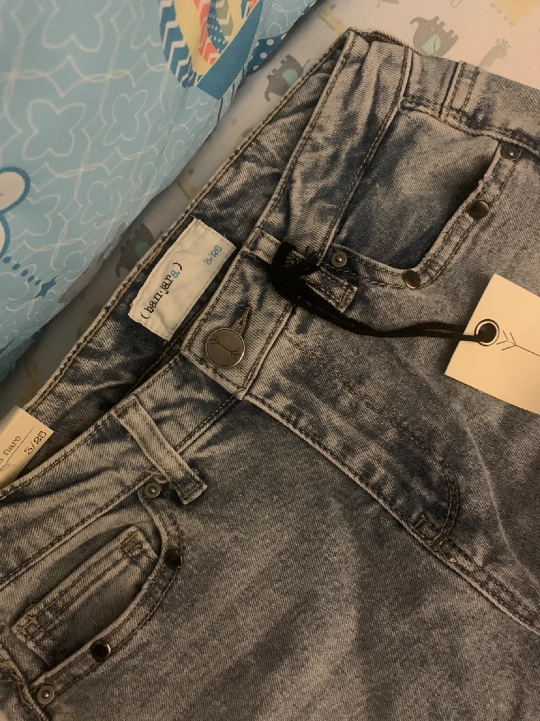 Light wash denim jeans with snap button detailing along the flared legs. Features a classic 5-pocket design. Size 3/25. Made from durable denim material.