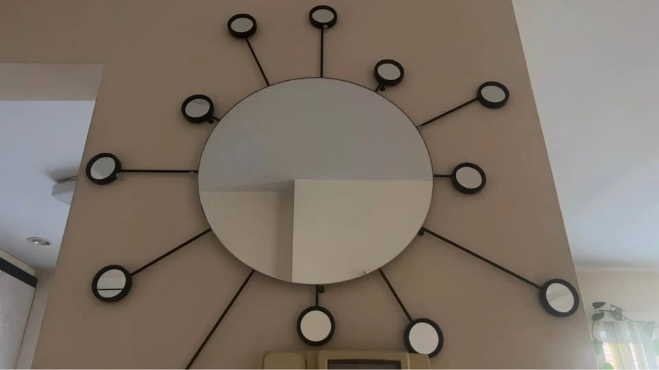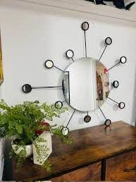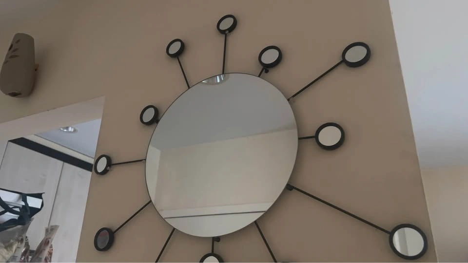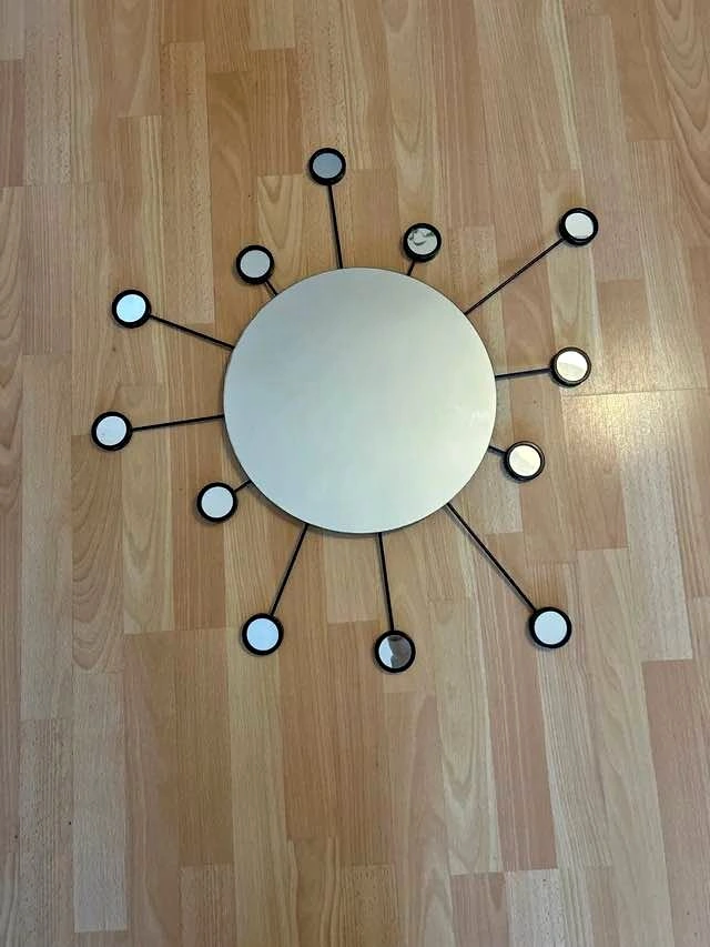 Beautiful metallic black decorative mirror. It's ready to spruce up your space. This is an IKEA Figgjo sunburst wall mirror, featuring a central circular mirror surrounded by smaller radiating mirrors on black metal arms.