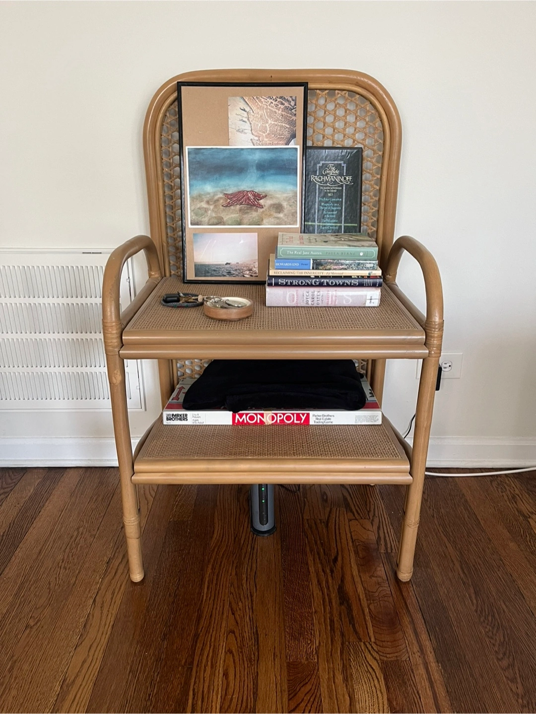 Very cute woven rattan nightstand, lightly used. Lower shelf not fully screwed in